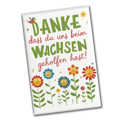 - Der "Danke dass du uns beim Wachsen geholfen hast!" Magnet zeigt ein fröhliches, spielerisches Design auf weißem Hintergrund. Große grüne Buchstaben formen das Wort "DANKE". Ein kleiner Cartoon-Vogel und bunte Blumen im Volkskunststil verleihen dem Magneten eine kinderfreundliche Atmosphäre.