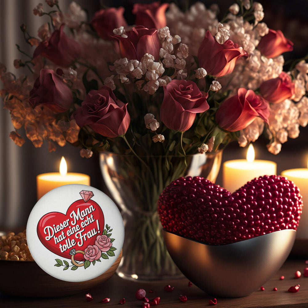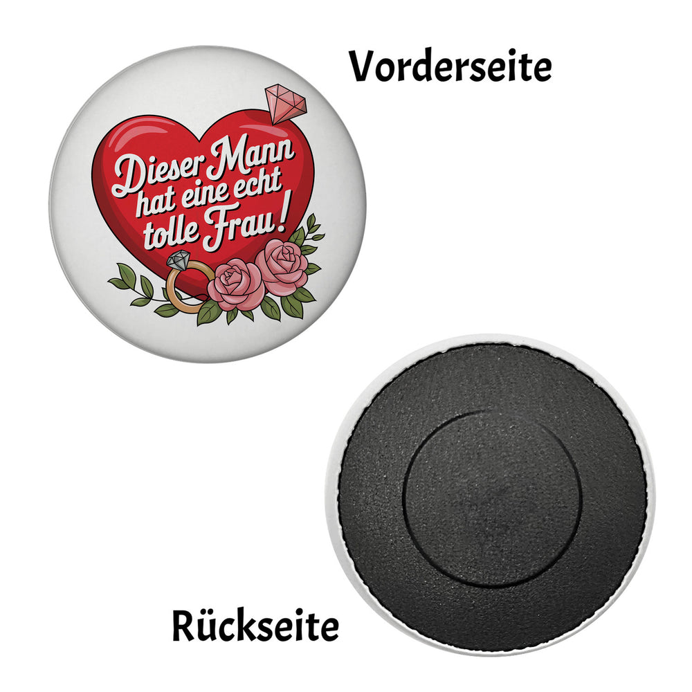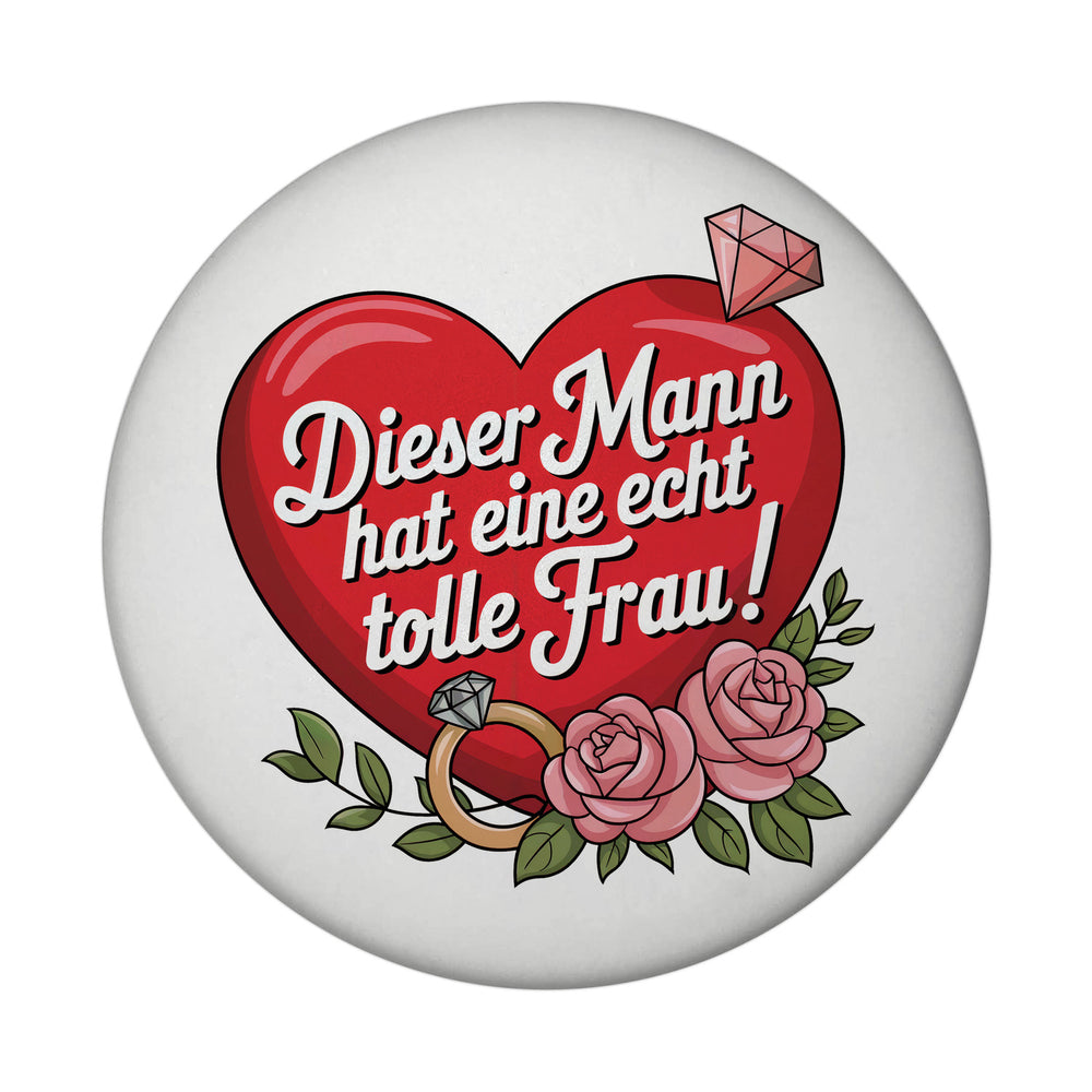 - Du suchst nach dem ultimativen Liebesbeweis? Unser runder Magnet mit großem rotem Herz und dem Spruch "Dieser Mann hat eine echt tolle Frau" ist genau das Richtige! Mit rosa Rosen und einem funkelnden Diamantring blühst du deiner Liebsten regelrecht zu - ein Geschenk, das sie garantiert zum Strahlen bringt!