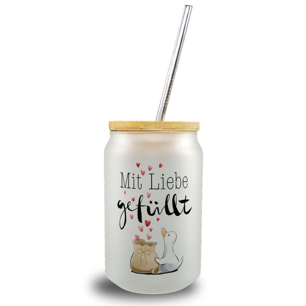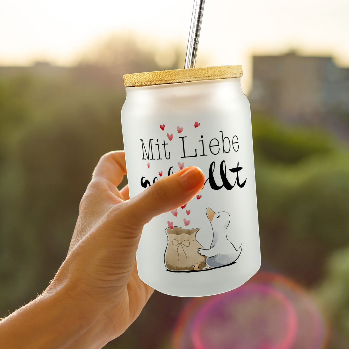 Ente Trinkglas mit Bambusdeckel mit Spruch Mit Liebe gefüllt