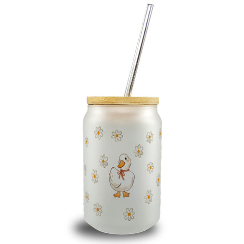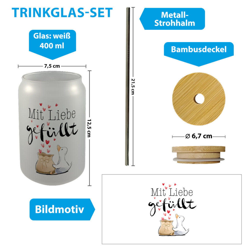 • Lieferumfang: 1x Ente Trinkglas mit Bambusdeckel mit Spruch Mit Liebe gefüllt