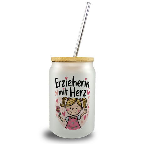 fröhliches Cartoon-Mädchen Erzieherin mit Herz Trinkglas mit Bambusdeckel