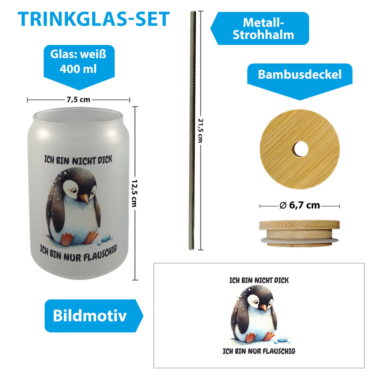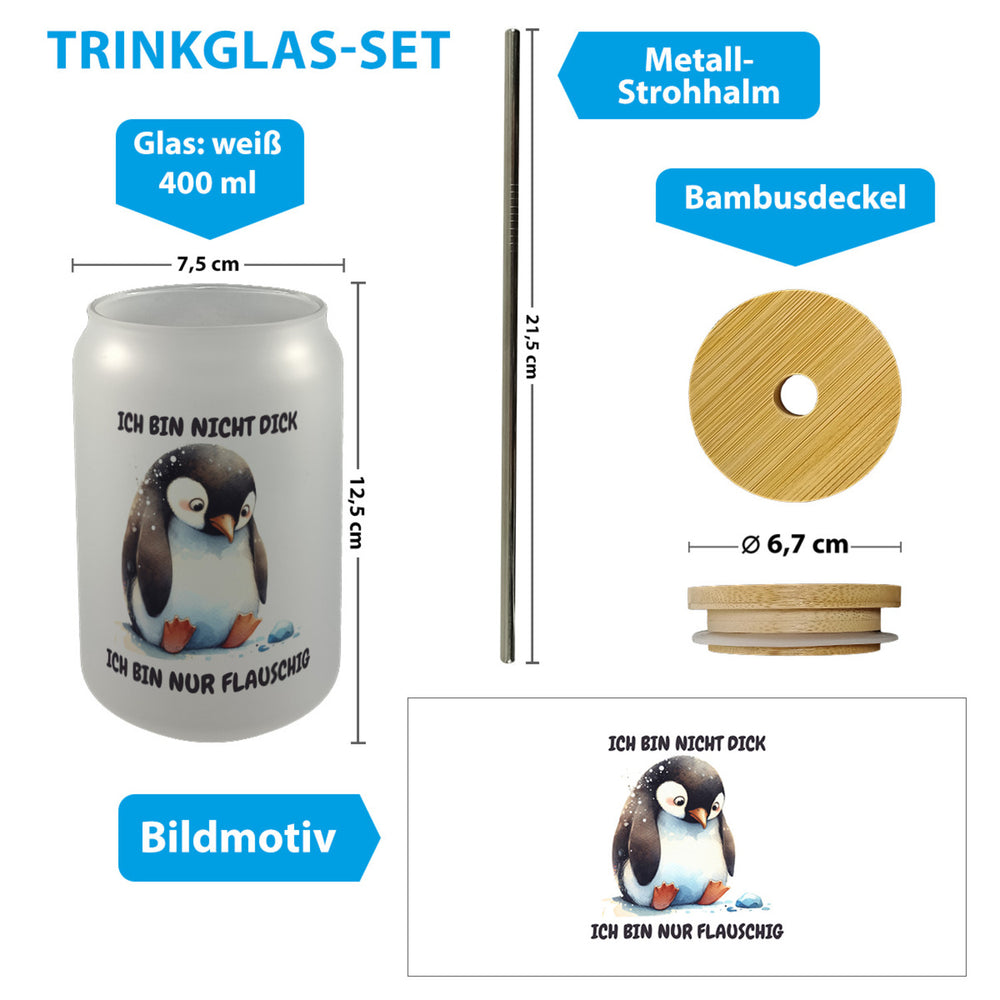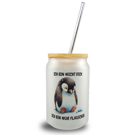 • 1x Flauschiger Pinguin Trinkglas mit Bambusdeckel mit Spruch Nicht dick nur flauschig mit Bambusdeckel oder Henkel