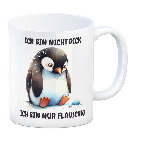 Flauschiger Pinguin Kaffeebecher mit Spruch Nicht dick nur flauschig