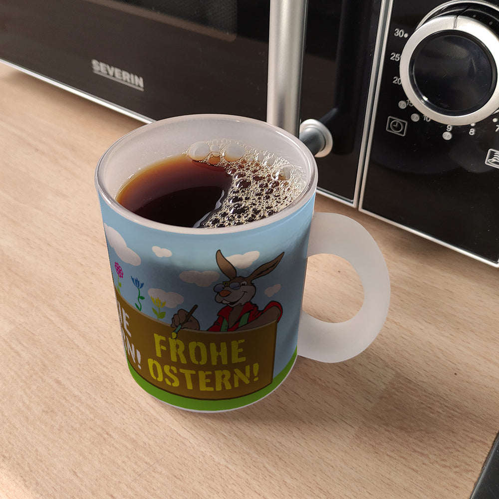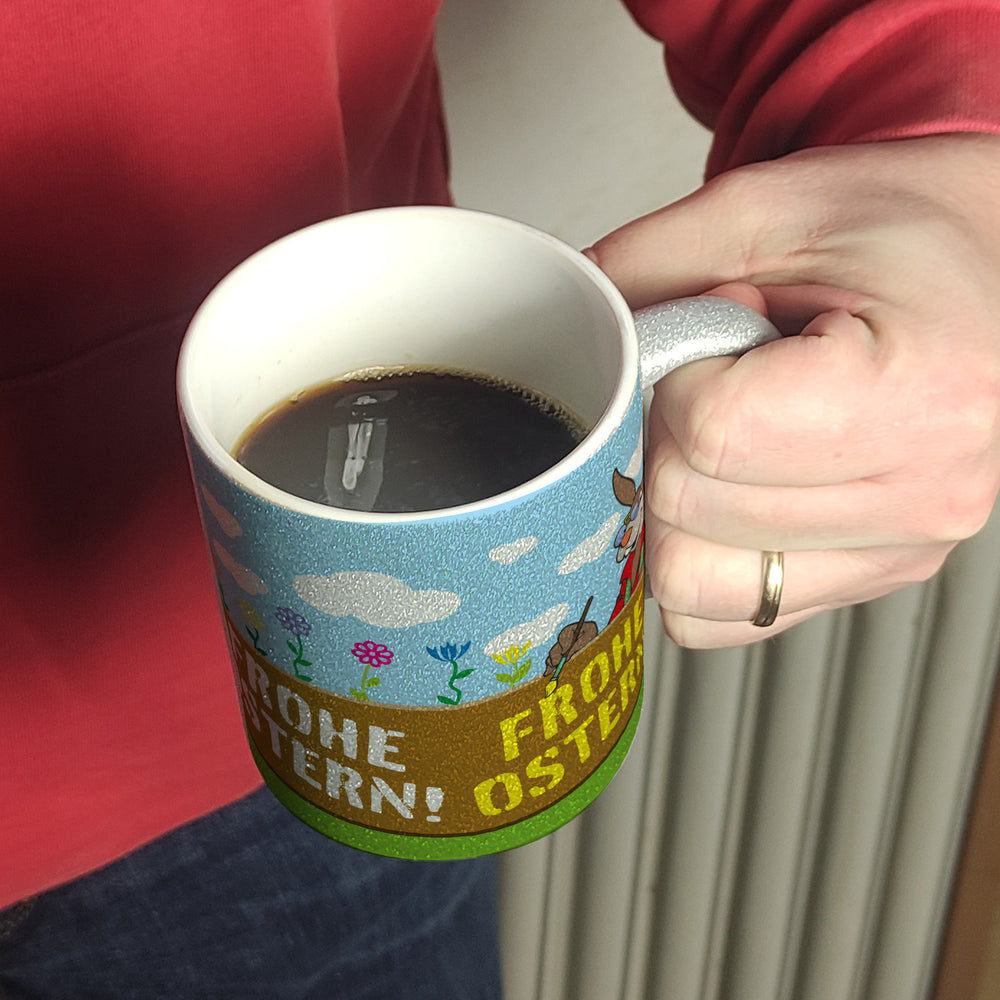 Machen Sie Ihren Liebsten zu Ostern eine Freude und verschenken Sie diesen witzigen Kaffeebecher mit Osterhase Motiv. Der Frohe Ostern! Spruch auf beiden Seiten der Tasse rundet das Design perfekt ab. Erhältlich in unterschiedlichen Varianten, ob als Standardtasse, Glastasse oder in der Silberedition mit Glitzereffekt - hier ist für jeden Geschmack etwas dabei. Dank des hochwertigen Drucks in unserer Manufaktur in Deutschland bleiben die Farben auch nach einiger Zeit noch schön lebendig erhalten. Ein toller Blickfang für jede Kaffeerunde! Schenken Sie Freude und machen Sie Ostern zu einem unvergesslichen Tag mit diesem witzigen Kaffeebecher.