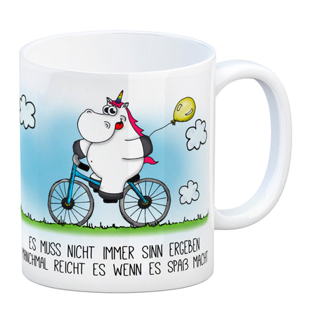 Honeycorns Kaffeebecher mit Einhorn Fahrrad Motiv und Spruch: Es muss nicht immer Sinn ergeben...