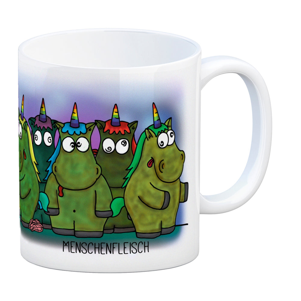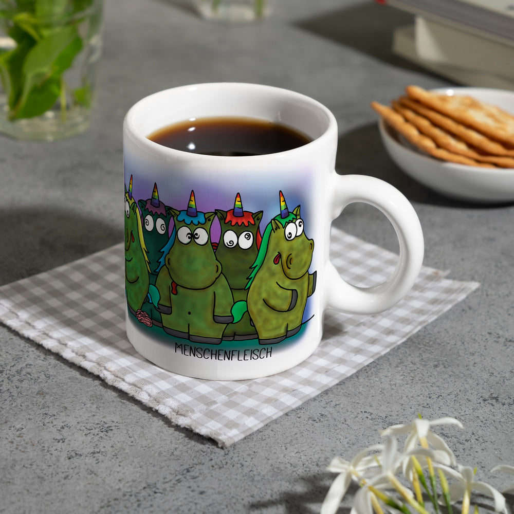 Honeycorns Kaffeebecher mit Einhorn Motiv und Spruch: Menschenfleisch