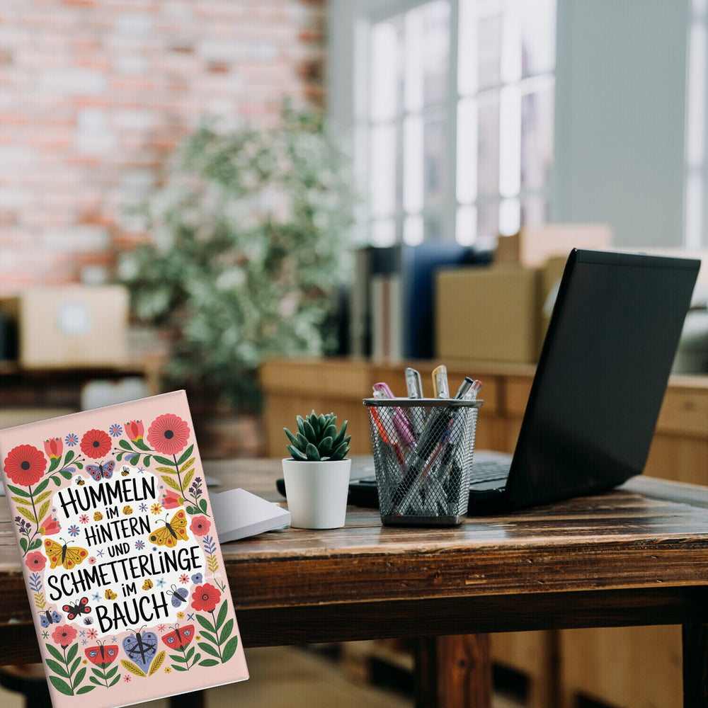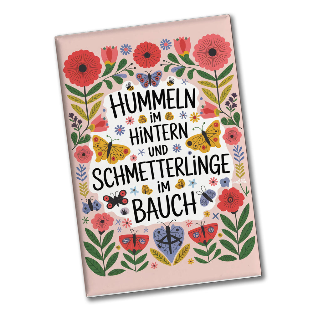 - Entdecken Sie den Hummeln im Hintern Schmetterlinge im Bauch Souvenir Magnet! Dieses eckige Magnetwunder vereint Blumen, Schmetterlinge und Bienen in einem lebhaften, farbenfrohen Design. Pinke und rote Blüten mit grünen Blättern tanzen um den spaßigen Spruch. Gelbe, blaue und lila Schmetterlinge sowie schwarz-gelbe Bienen verleihen dem Bild einen natürlichen, verspielten Touch.