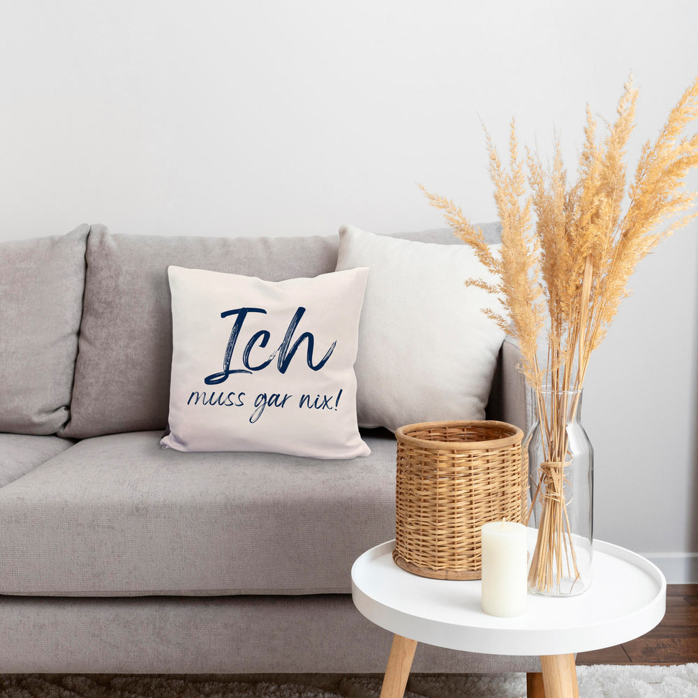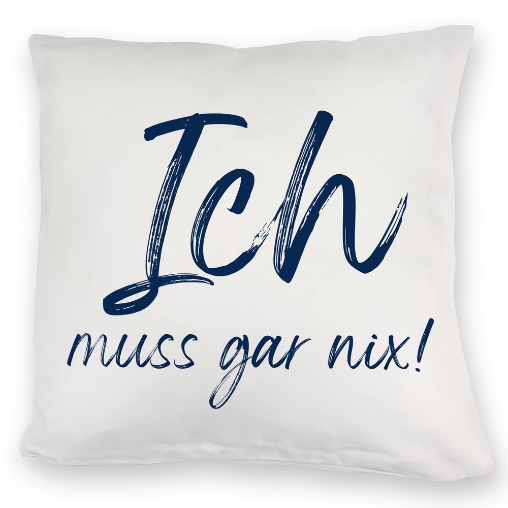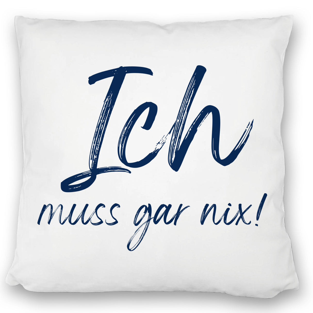 - Dieses Kissen ist nicht nur ein Kissen, es ist eine Aussage! Mit seinem fröhlichen Blau und dem unmissverständlichen Spruch "Ich muss gar nix" wird es zum Mittelpunkt jeder Couch. Ob als Deko-Element oder zum gemütlichen Kuscheln, dieses Kissen ist ein Must-have für jeden, der mal so richtig abschalten will.