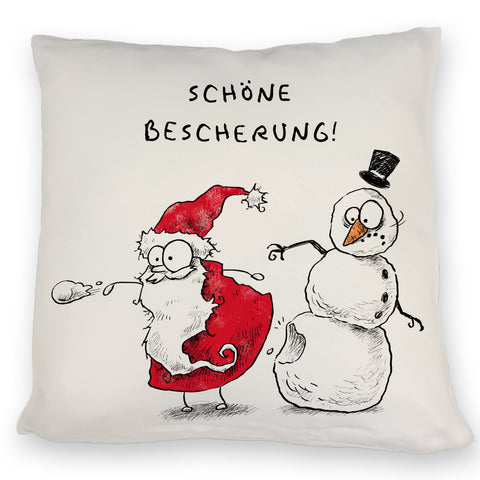Weihnachtsmann und Schneemann Kissen mit Spruch Schöne Bescherung