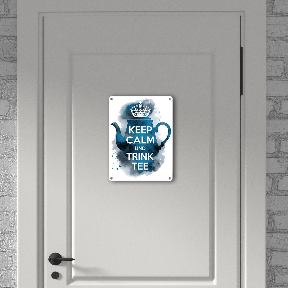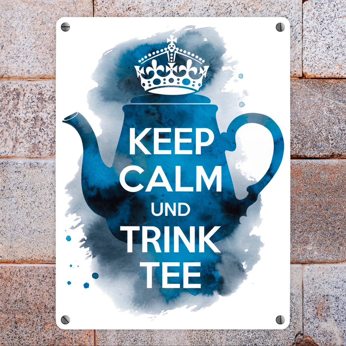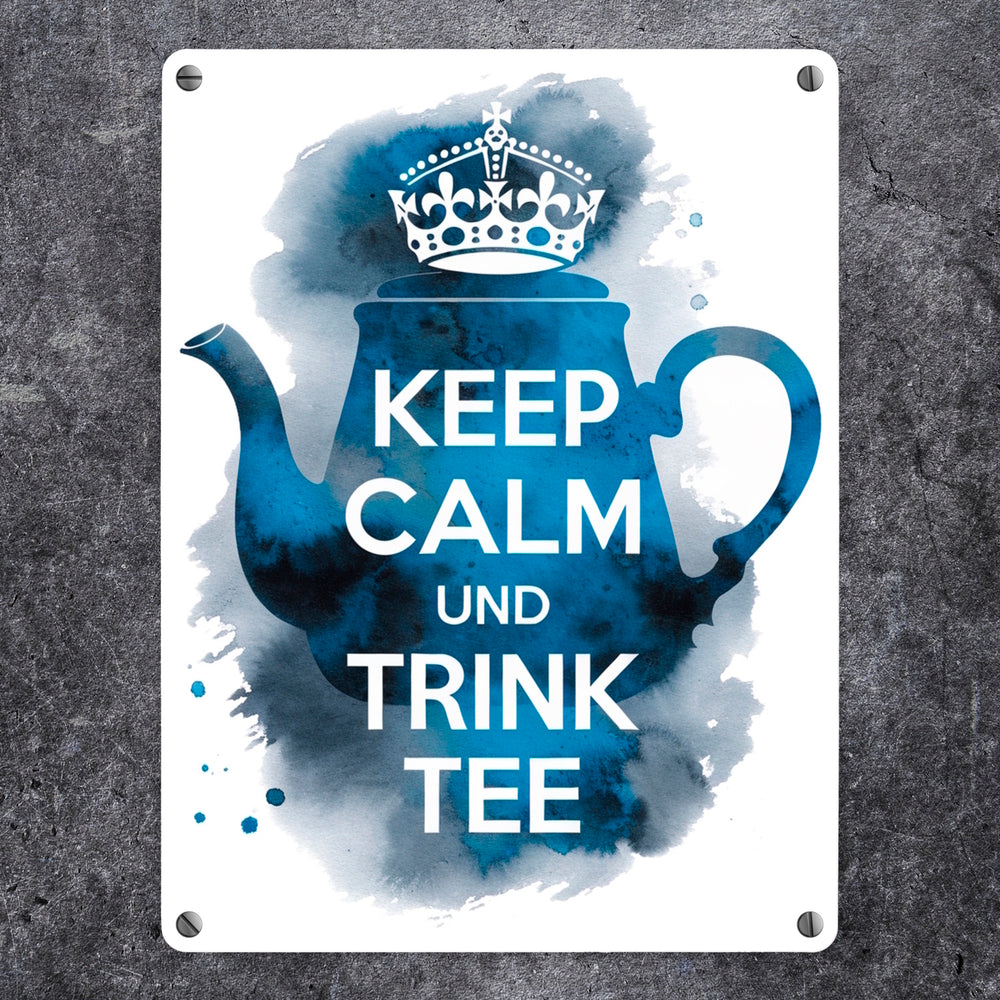 • Dieses originelle Metallschild zeigt eine farbenfrohe Teekanne mit einer Krone oben drauf. Der Hintergrund ist in einem traumhaften Aquarell-Blau gehalten. In großen, fetten Buchstaben steht "KEEP CALM UND TRINK TEE" auf der Teekanne, die mittig positioniert ist. Ein echter Hingucker für jede Wand!