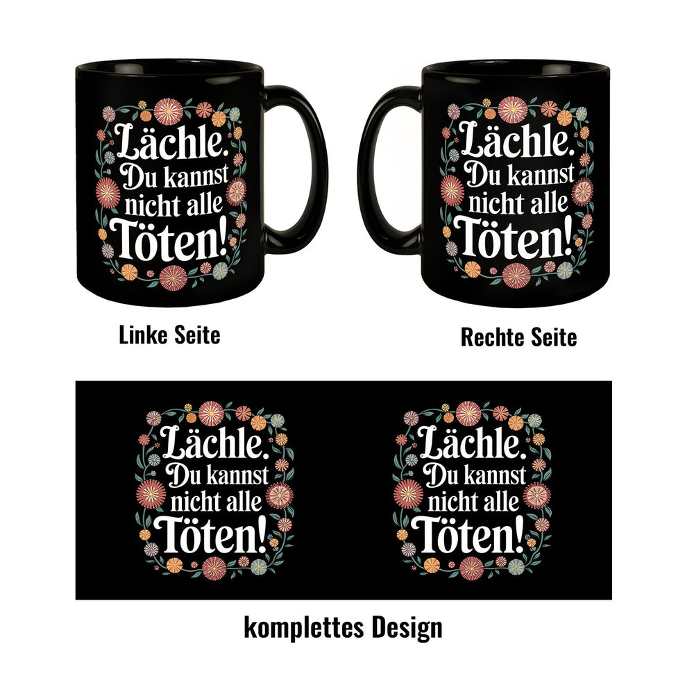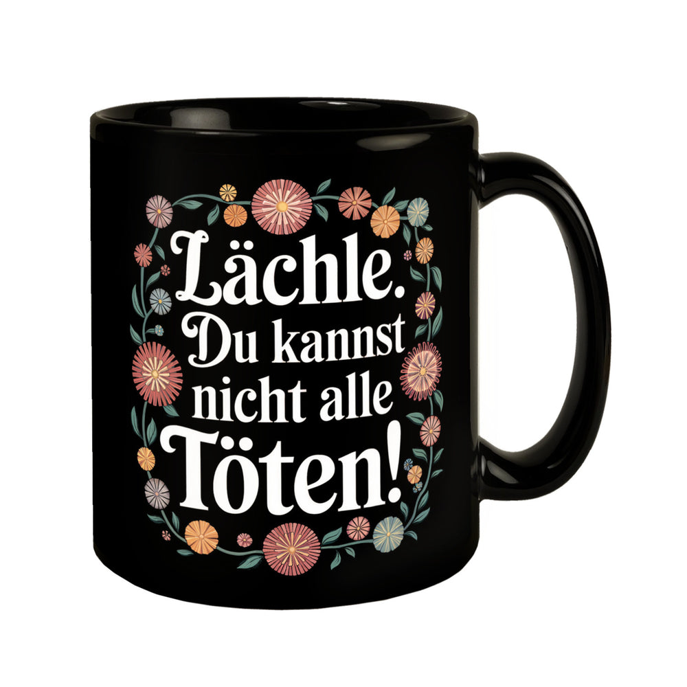 - Entdecke den schwarzen Kaffeebecher, der nicht nur deinen Kaffee warmhält, sondern auch dein Lächeln! Mit einem frechen Spruch "Lächle. Du kannst nicht alle töten." und kunstvollen Blumenornamenten ist er der perfekte Begleiter für humorvolle Pausen. Ein Must-Have für alle, die einen Schuss Sarkasmus im Alltag lieben!