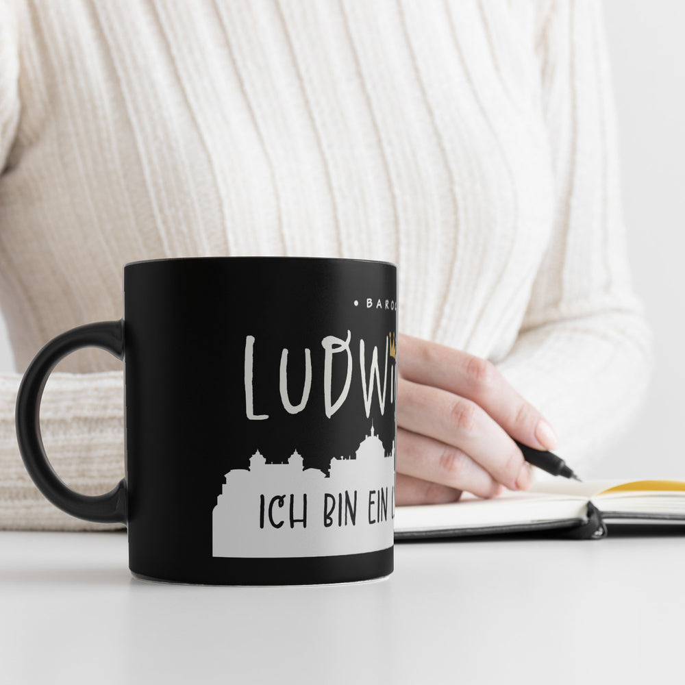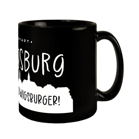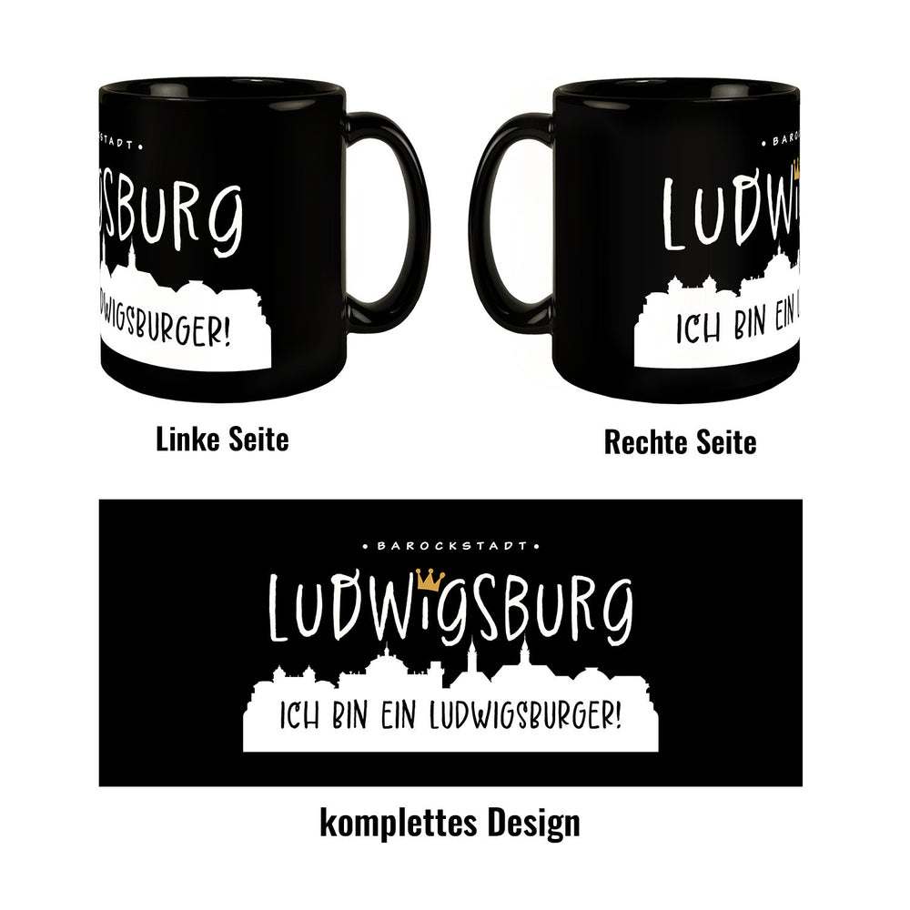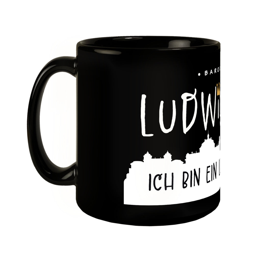 • Diese schicke Tasse zeigt die Ludwigsburger Skyline in strahlendem Weiß auf elegantem Schwarz. Über der malerischen Silhouette thront stolz eine goldene Krone. Mit dem Spruch "Ich bin ein Ludwigsburger!" und einem charmanten Schriftzug "BAROCKSTADT" wird jeder Morgenkaffee ein königliches Erlebnis!