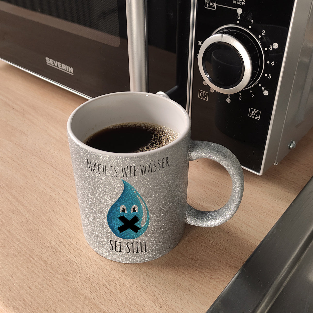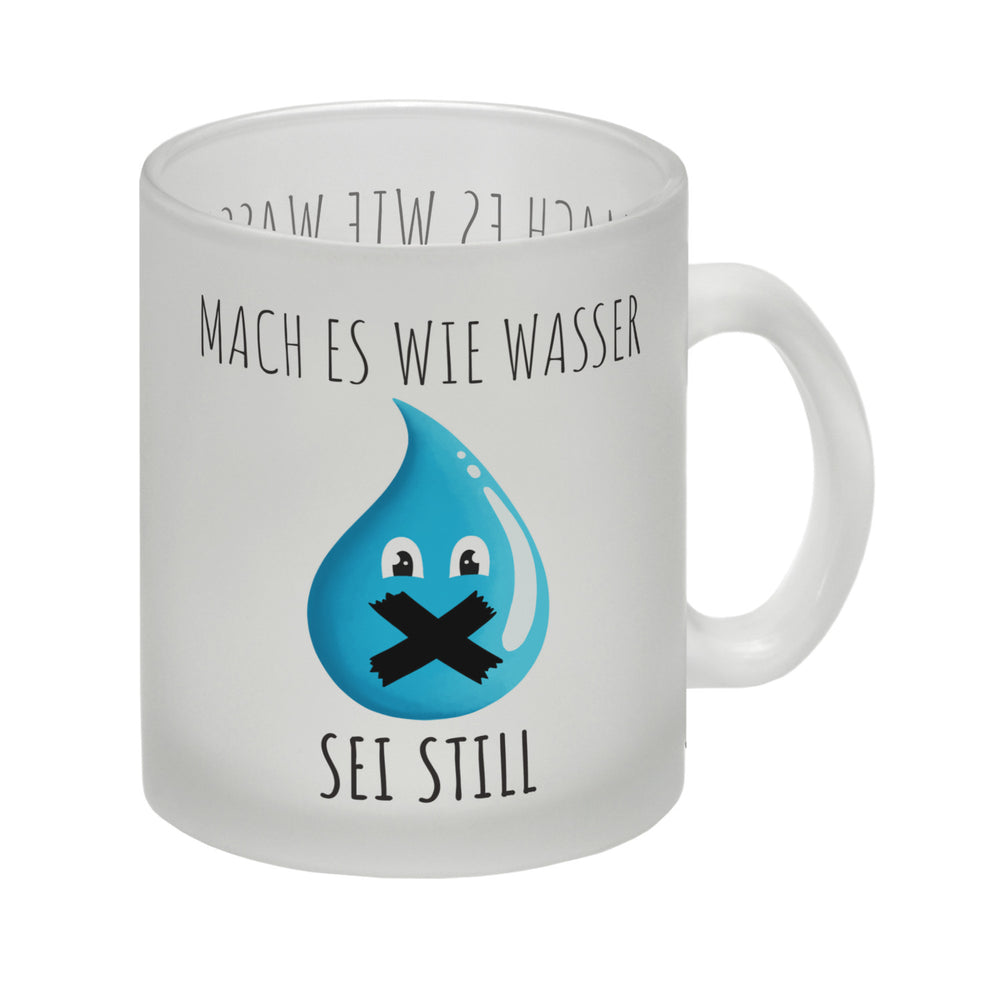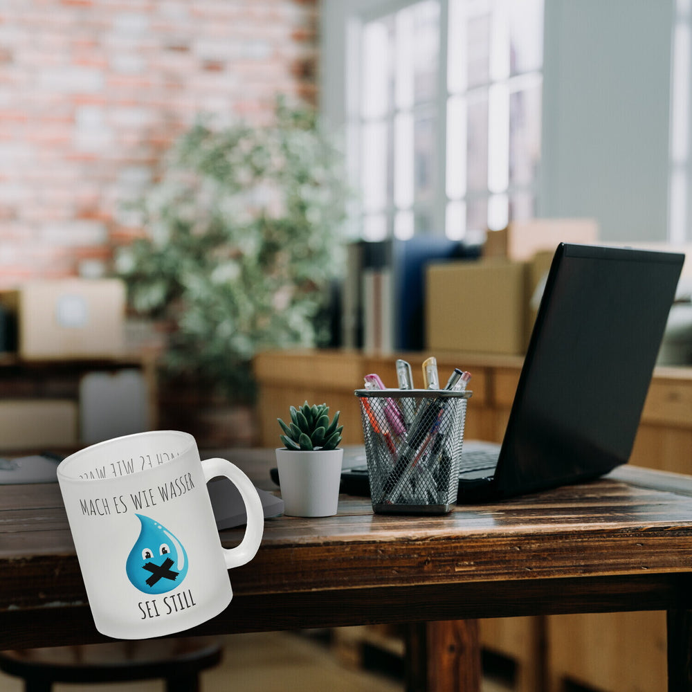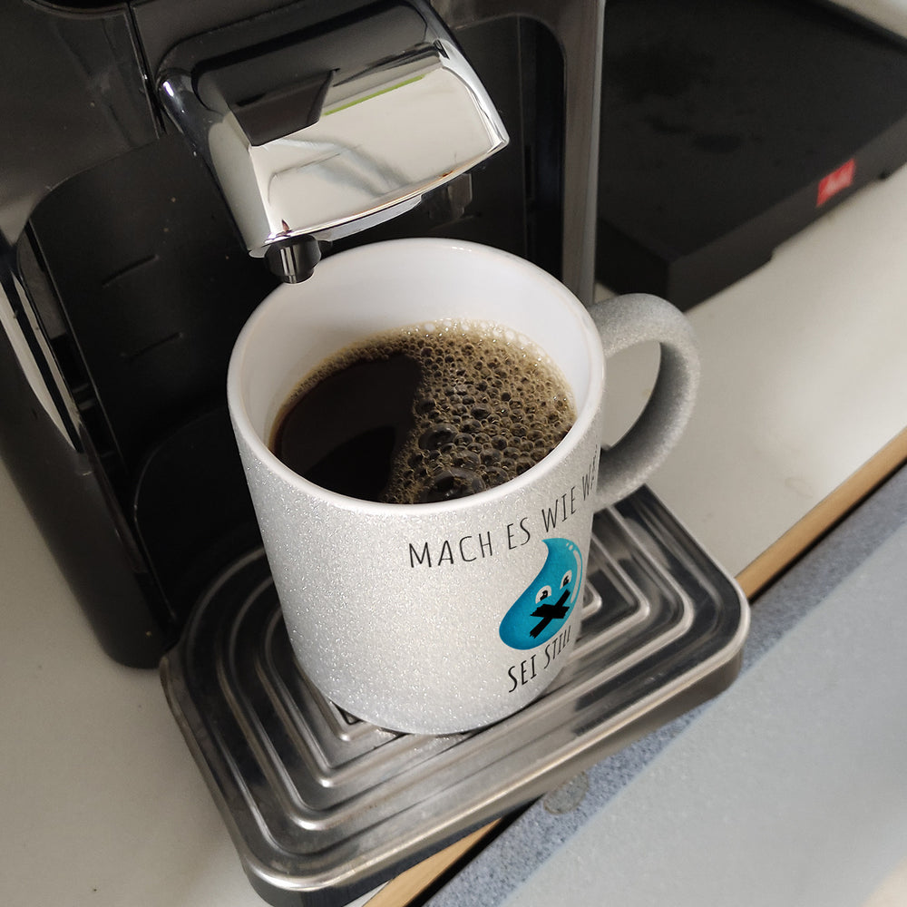 Die ideale Lösung für alle, die nicht ständig von Kollegen angesprochen werden möchten: Der witzige Kaffeebecher „Mach es wie Wasser sei still“. Diese Tasse ist ein absoluter Hingucker und sorgt mit dem originellen Motiv für viele Lacher. Der Kaffeebecher ist in verschiedenen Variationen erhältlich: Als weiße Standardtasse, mit farbigem Henkel und Innenseite, als edle Glastasse oder in der exklusiven Silberedition mit Glitzereffekt. Mit Sorgfalt bedruckt in unserer Manufaktur in Deutschland. Eine perfekte Geschenkidee für jeden, der gerne witzige Tassen sammelt oder einfach nur eine nette Art hat, seine Kollegen zu ermahnen! Egal ob im Büro oder zu Hause - mit dieser Tasse machst du garantiert alles richtig.