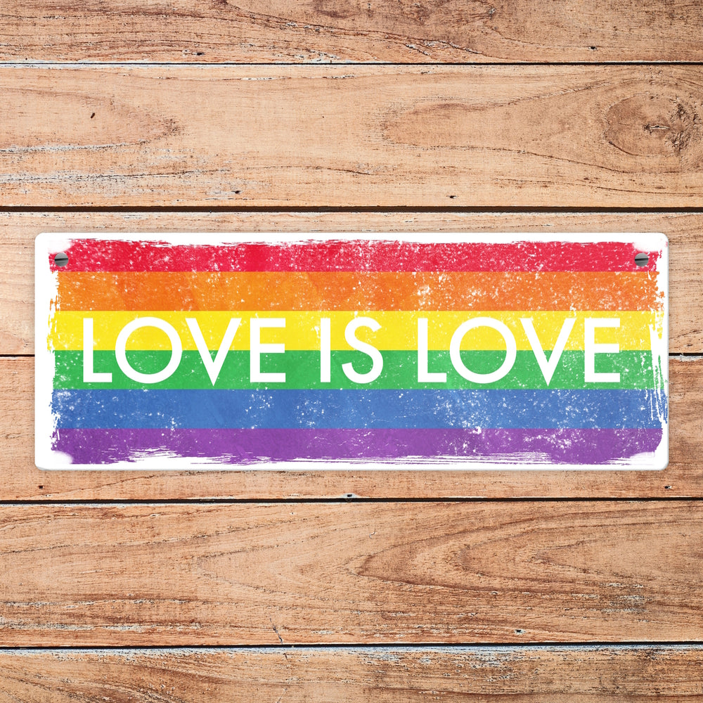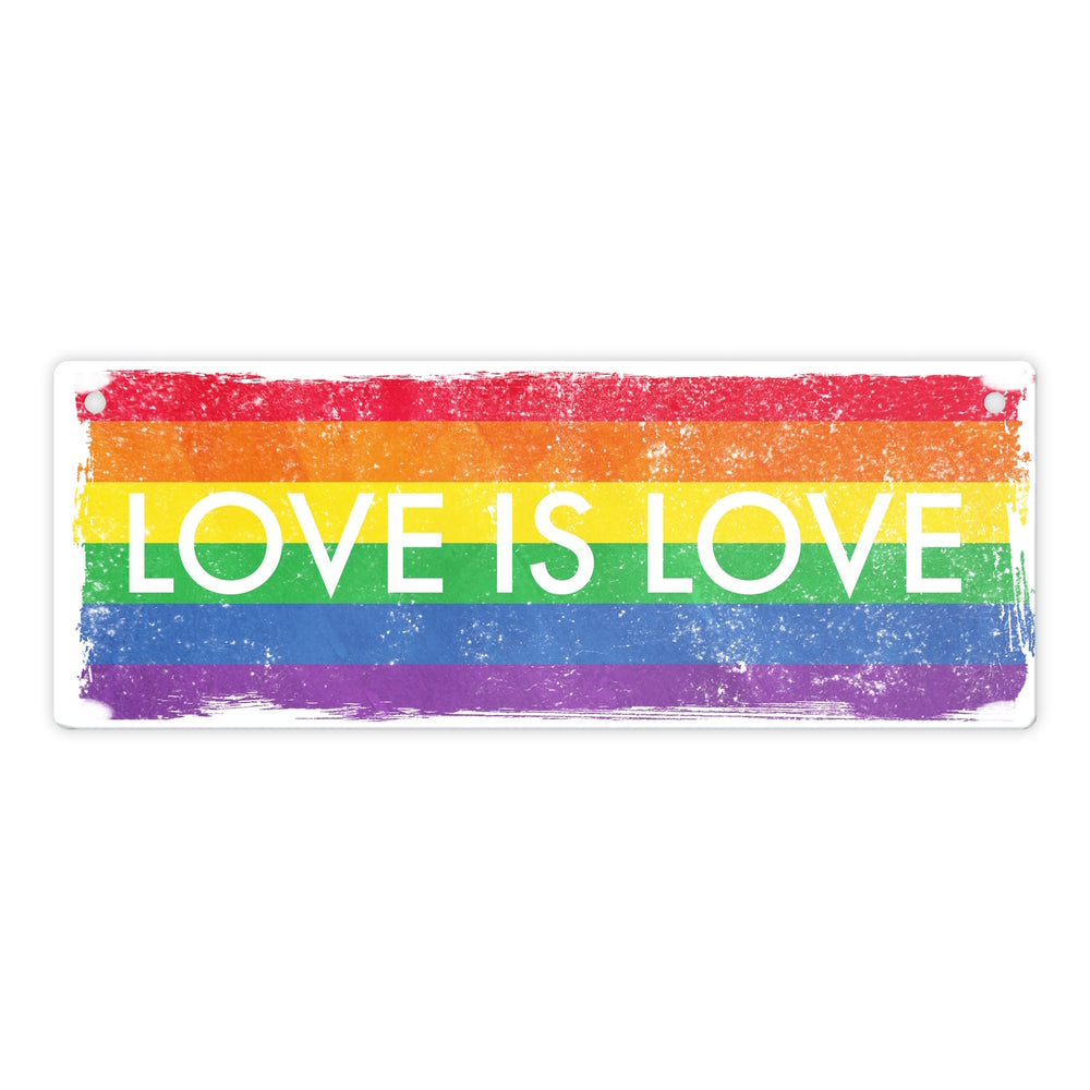 Metallschild mit Regenbogen Motiv - Love is Love mit LGBTQ Flagge