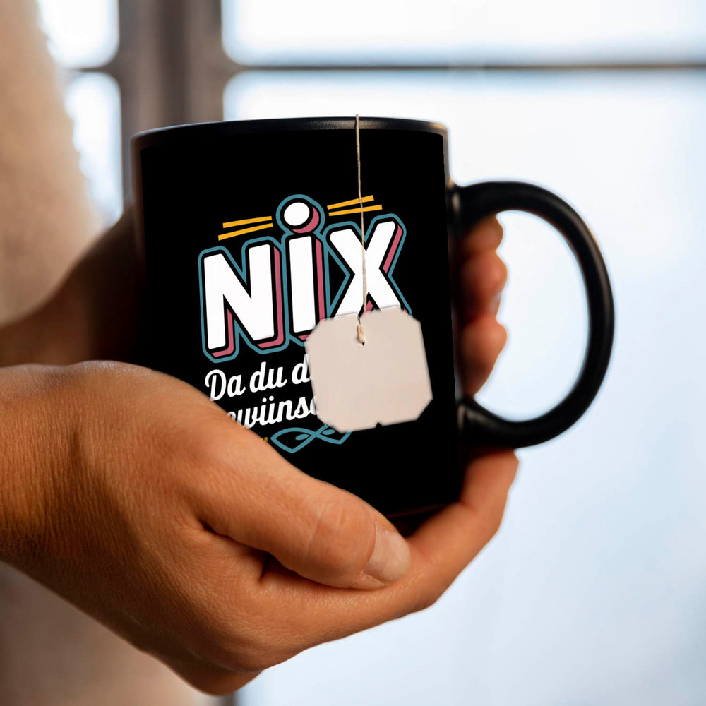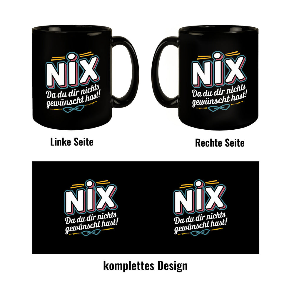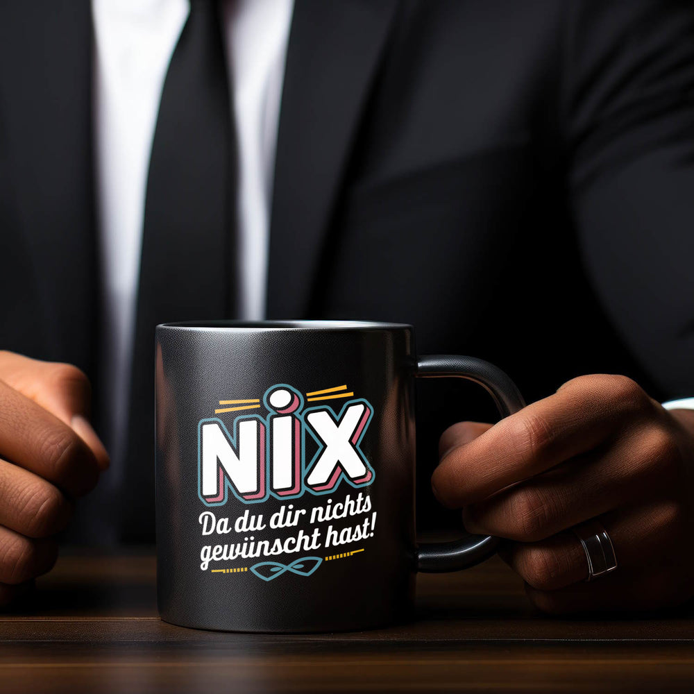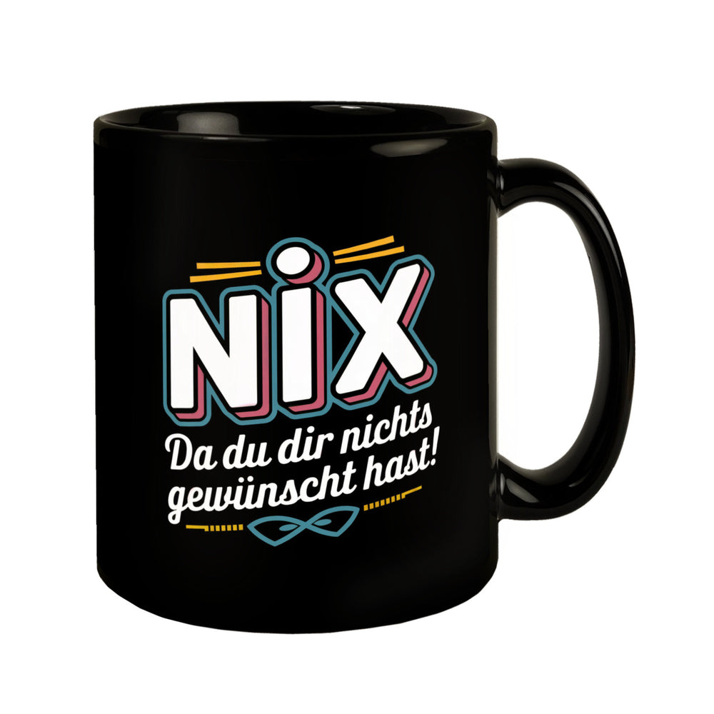 - Stell dir vor, du sitzt gemütlich mit deinem Kaffee, und dein Becher sagt mehr aus als nur "Guten Morgen". Die NIX Tasse ist ein schwarzer Kaffeebecher mit einem lustigen Twist, perfekt für die minimalistische Seele, die sich nichts wünscht – wortwörtlich!
