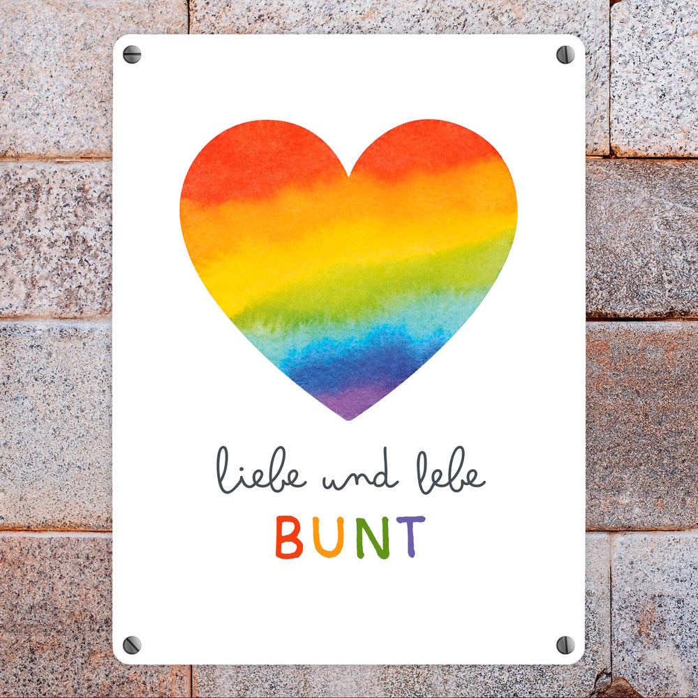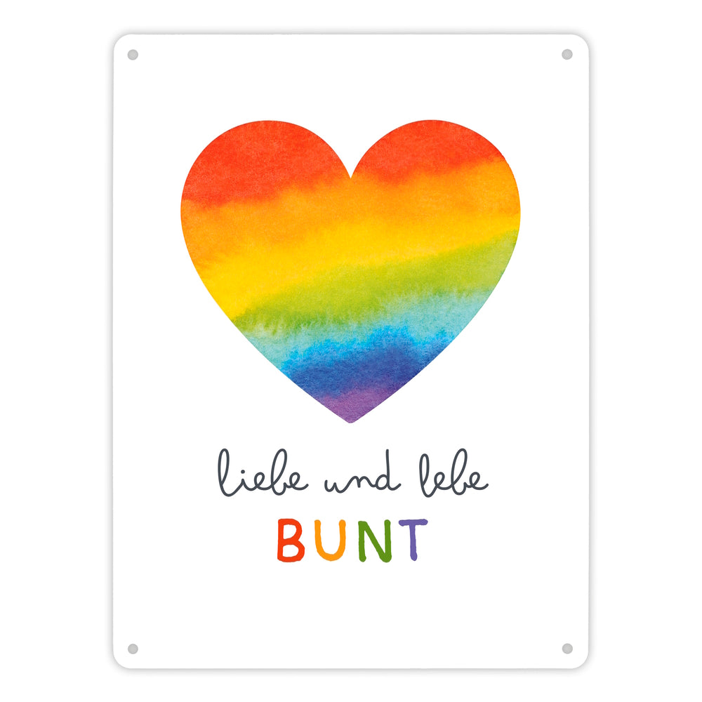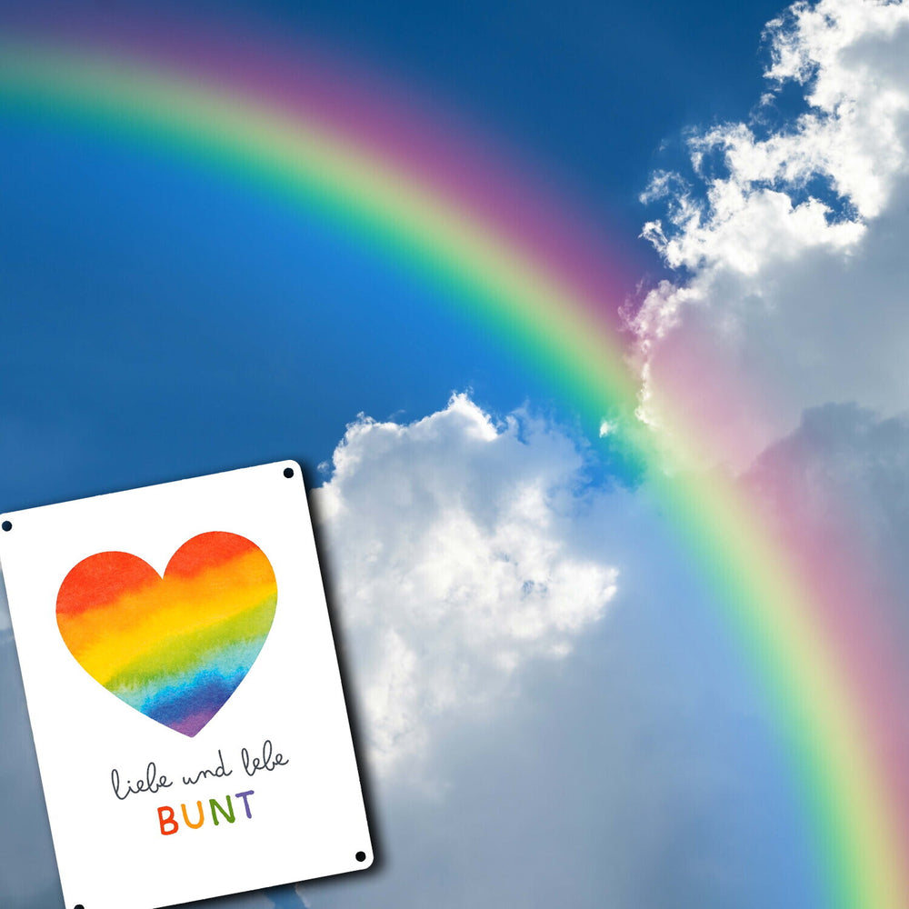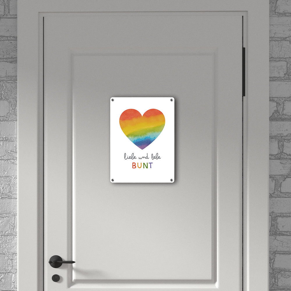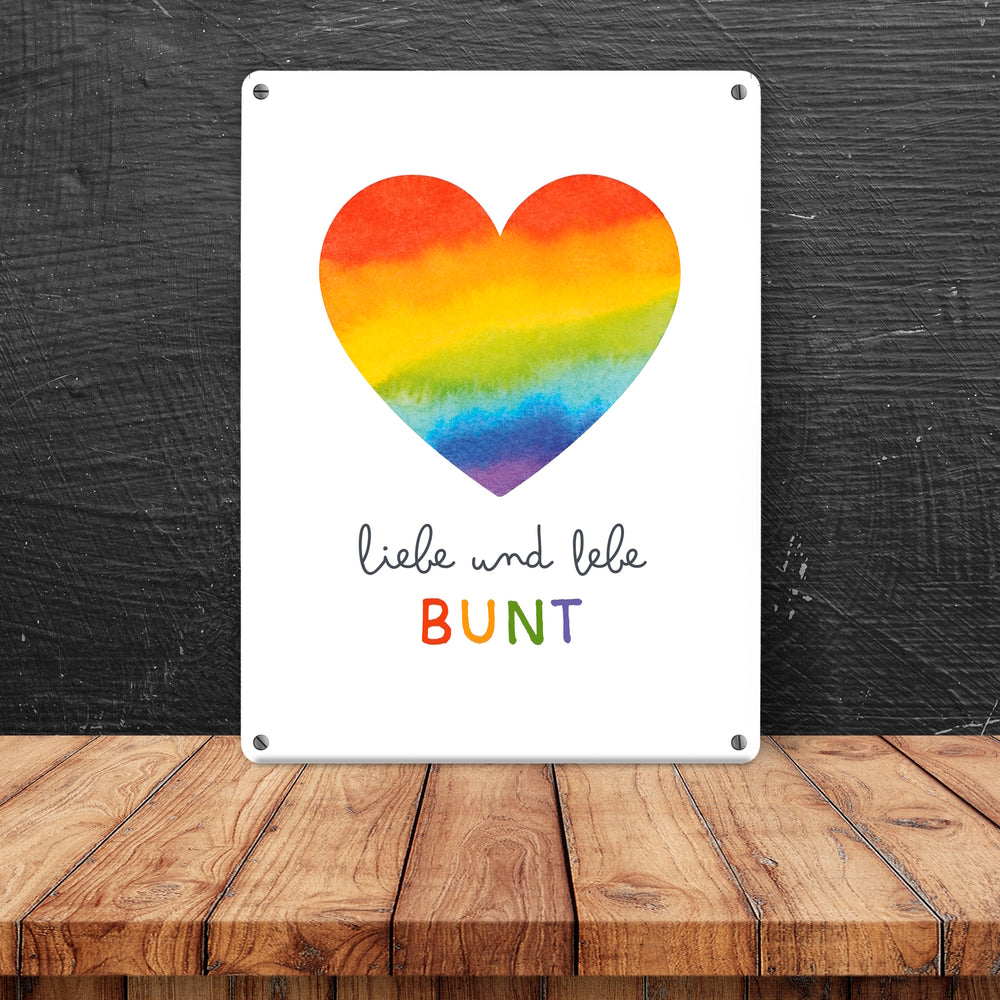 - Kunterbunt und herzallerliebst! Das Regenbogenherz Metallschild ist das perfekte Accessoire für alle, die ihre Liebe zur Vielfalt zeigen wollen. Mit einem strahlenden Regenbogenherz und dem motivierenden Spruch "Liebe und lebe bunt" bringt dieses Schild Farbe und Freude in jedes Zuhause.