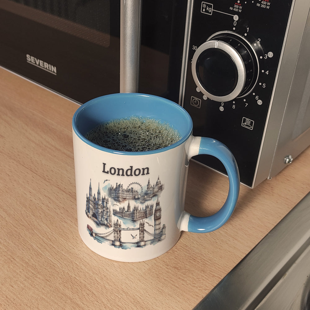 - Schlürfen Sie Ihren Tee mit britischem Charme – unser Kaffeebecher präsentiert sich als echter Hingucker! Mit Big Ben und Tower Bridge auf der Außenseite können Sie sich beim Frühstück wie in London fühlen, ohne auch nur einen Fuß vor die Tür zu setzen.