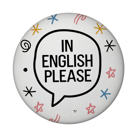 - Dieser humorvolle Kühlschrankmagnet besticht durch sein farbenfrohes Design. Ein weißer Hintergrund, dekoriert mit einer großen Sprechblase, verkündet den Aufruf: "IN ENGLISH PLEASE". Umrahmt ist die Sprechblase von bunten Kritzeleien, wie Sterne, Wirbel und Punkte, die das Motiv dynamisch und lebendig wirken lassen.