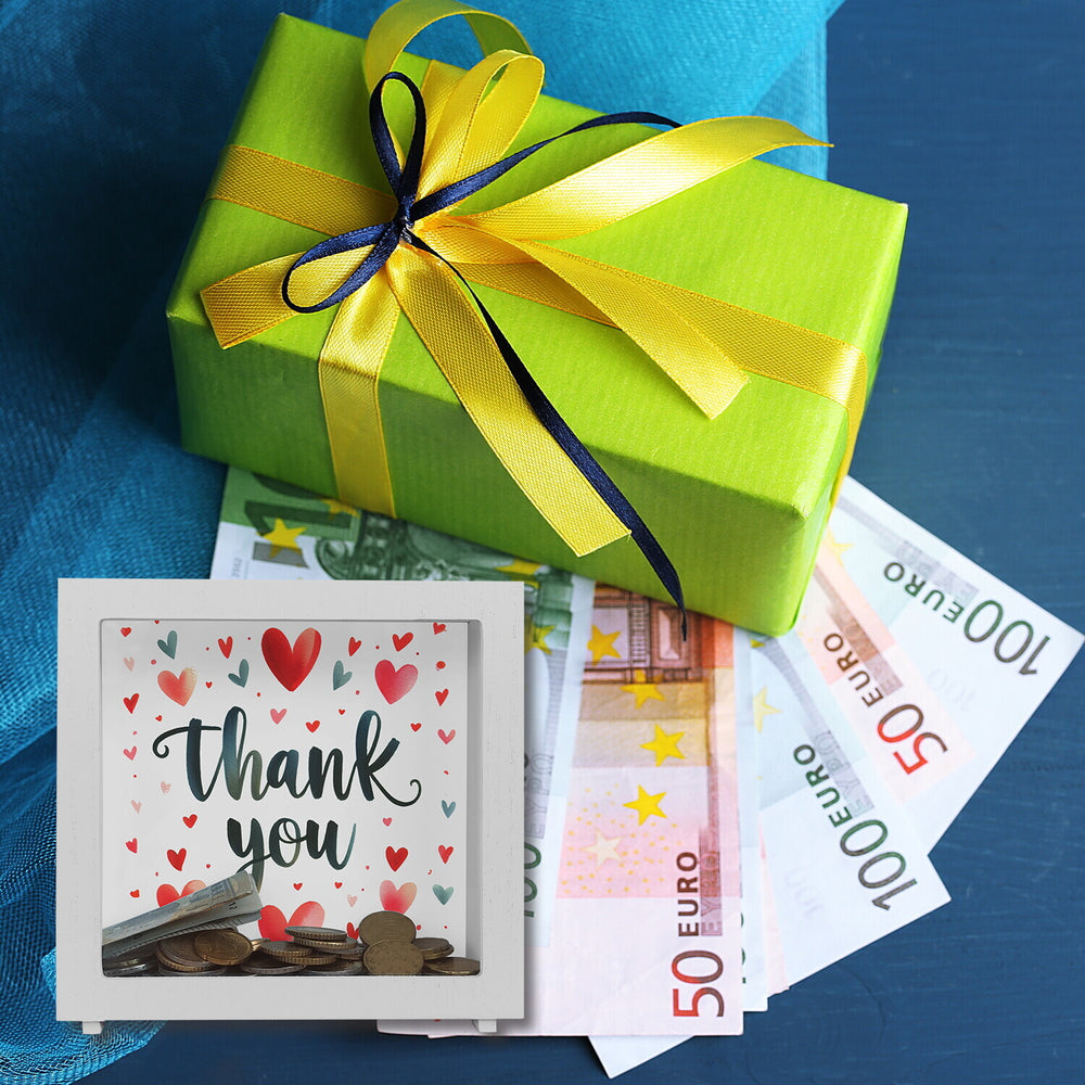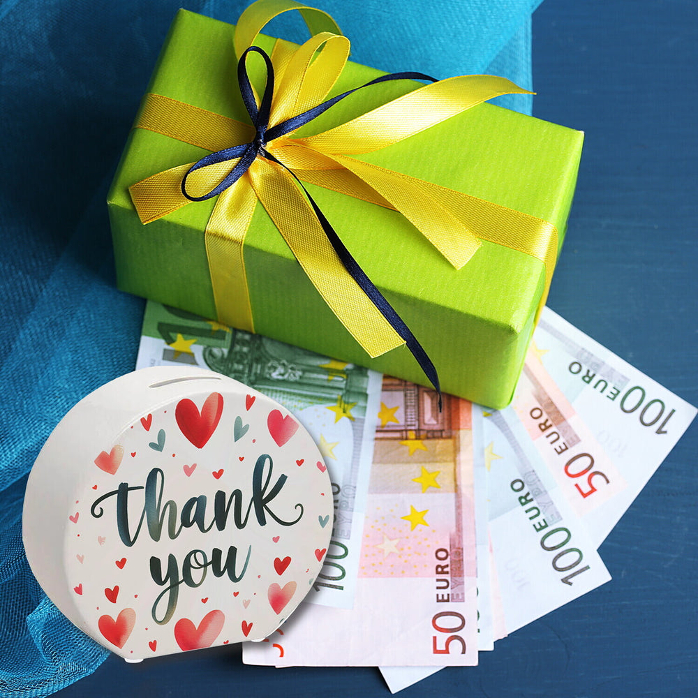 - Schluss mit langweiligen Sparschweinen! Verleihe deinem Sparen den Wow-Faktor mit unserer "Thank you" Spardose. Ein tolles Geschenk, um „Danke“ zu sagen – ob an Freunde, Familie oder dich selbst. Sparen war noch nie so herzerwärmend und stylish. Greif zu und lass die Herzen tanzen!