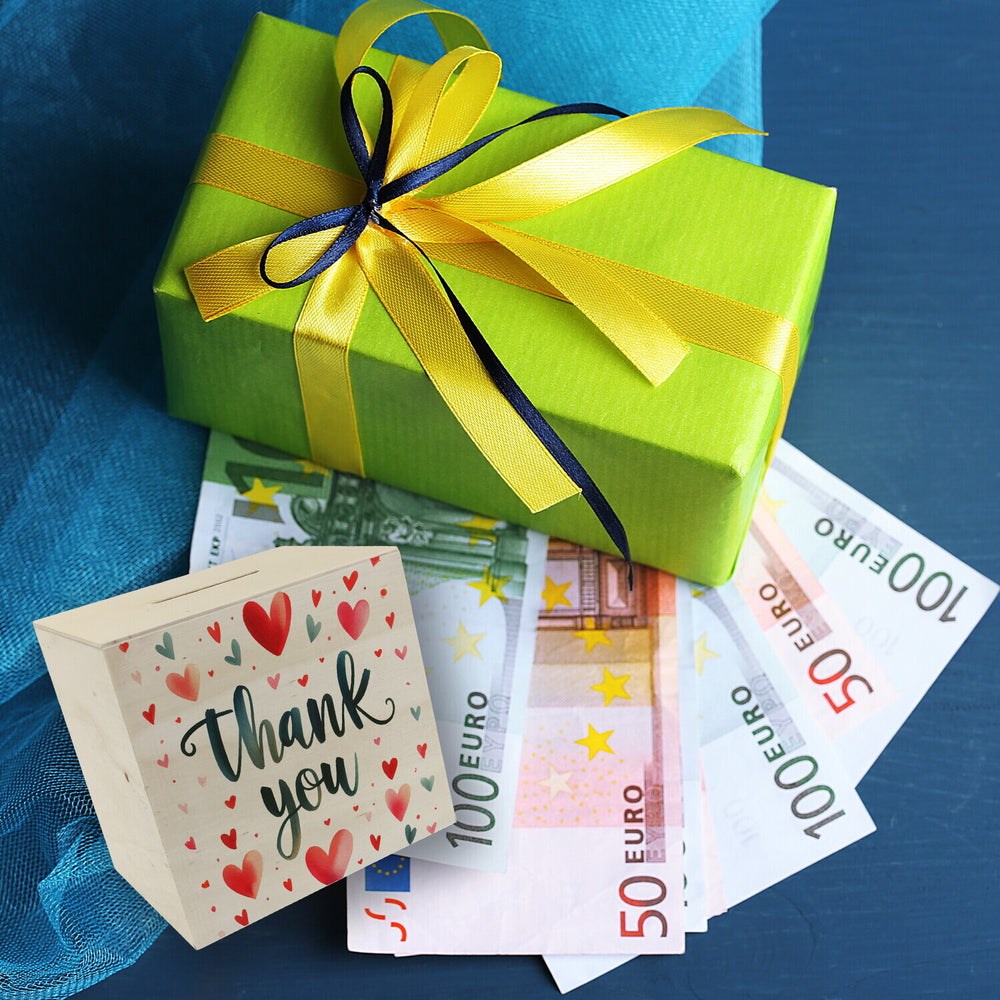 - 1x Thank you Spruch Spardose in der gewählten Ausführung