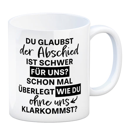- Die Tasse eignet sich perfekt als Abschiedsgeschenk für einen Kollegen oder eine Kollegin. Wenn auf deiner Arbeit bald ein Abschied anfällt, hast du mit dieser witzigen Tasse das passende Geschenk dafür.