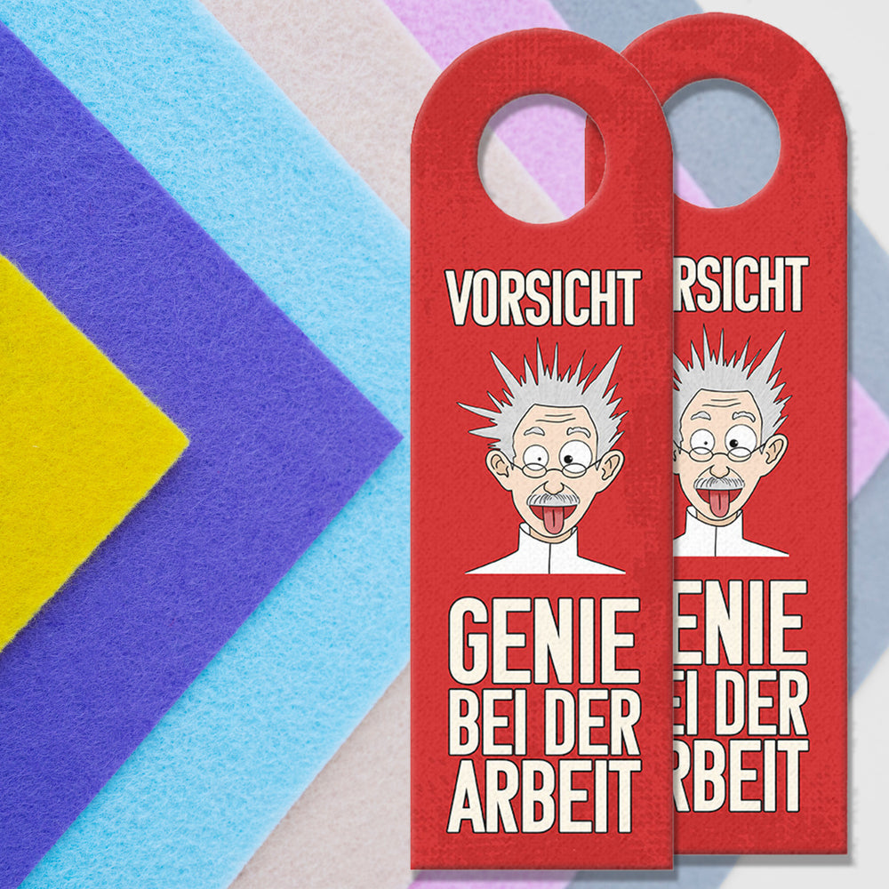 Der Vorsicht Genie bei der Arbeit Türhänger ist eine witzige und unterhaltsame Geschenkidee für Kollegen. Er ist in verschiedenen Sets erhältlich und besteht aus hochwertigem Filz, sodass er langlebiger als Türhänger aus Pappe ist. Mit dem praktischen Loch an der Türklinke kannst du den Türhänger schnell und einfach anbringen. Der Druck des Motivs in satten Farben macht den Türhänger zu etwas ganz Besonderem. Sei es als Geschenk oder als lustige Einrichtungsidee für das Büro- der Vorsicht Genie bei der Arbeit Türhänger ist immer eine gute Wahl!