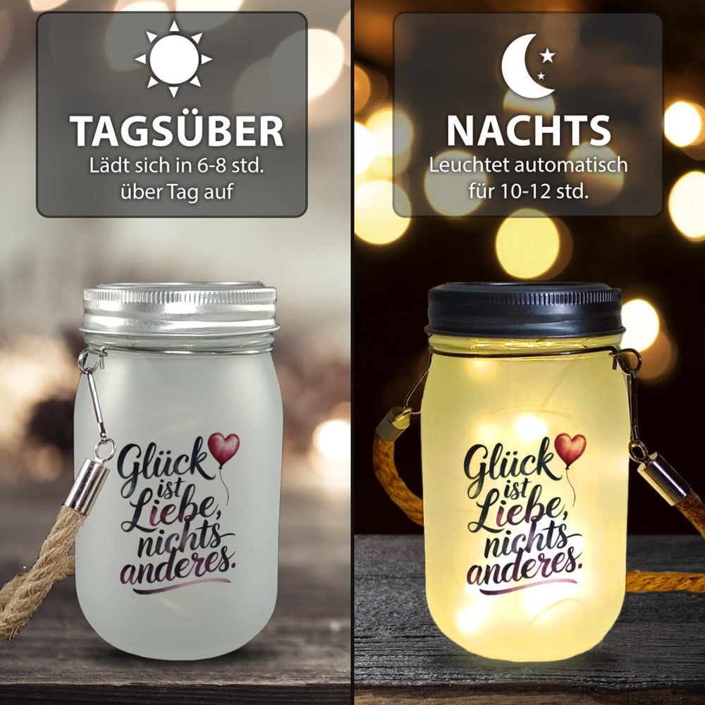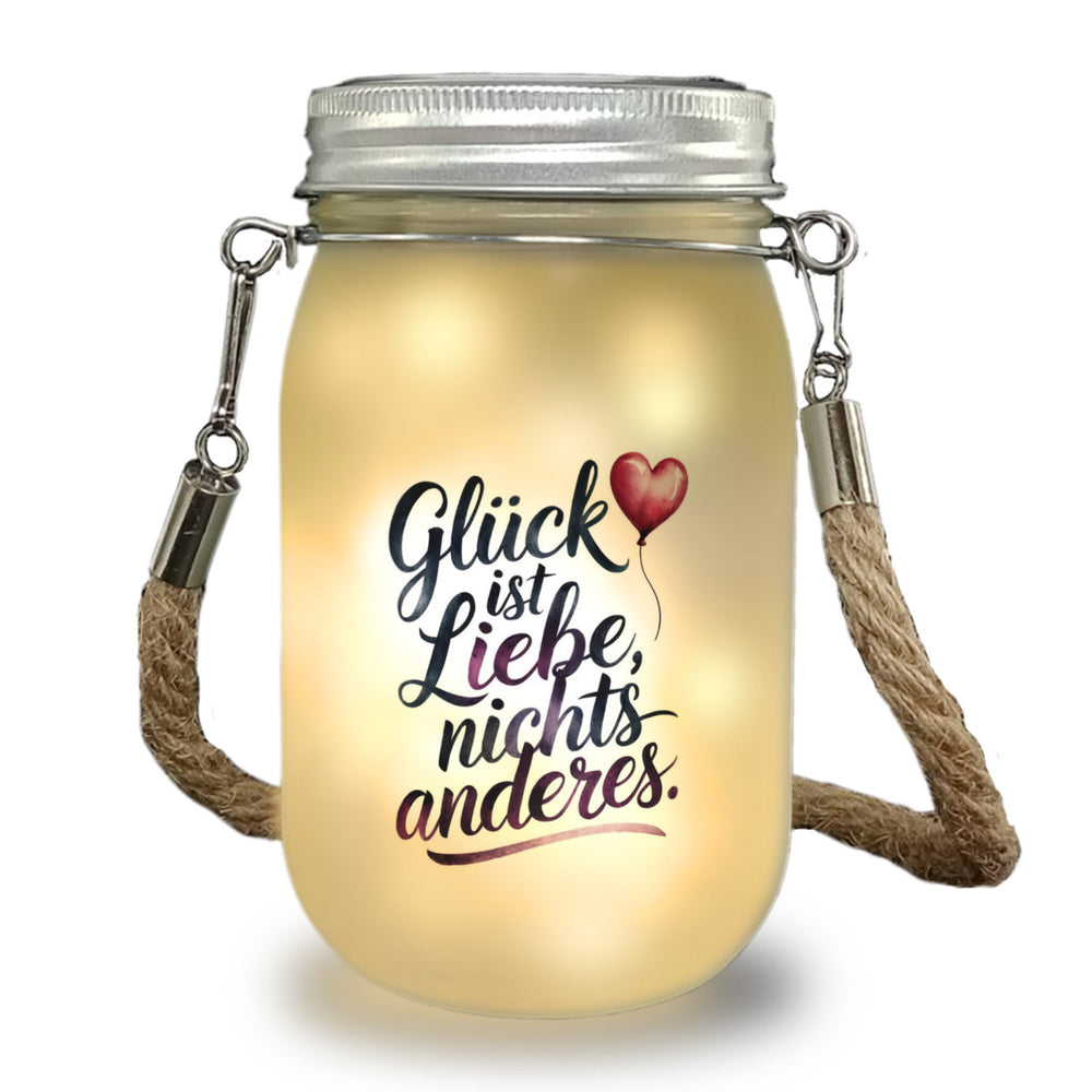 - Diese bezaubernde Solar-Laterne zeigt ein typografisches Aquarell-Design mit dem inspirierenden Spruch: "Glück ist Liebe, nichts anderes." Auf einem weißen Hintergrund leuchten die Worte in Lila und Blau, während "Liebe" in lebhaftem Rot hervortritt. Ein roter, herzförmiger Ballon rundet das romantische Motiv ab.