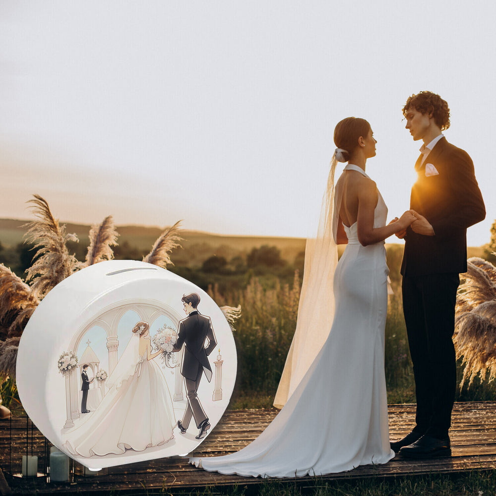 • Das Ja-Wort naht, die Spardose platzt – liegt das am Design oder an der Sparlust? Ausgerüstet mit Brautkleid und Anzug, lädt diese Spardose ein zum Träumen von Kirche, Zeremonie und feierlicher Trauung. Ein Muss für jedes Brautpaar, das mit Humor und Liebe seinen Ehehafen ansteuert. Mach's klirrend romantisch!