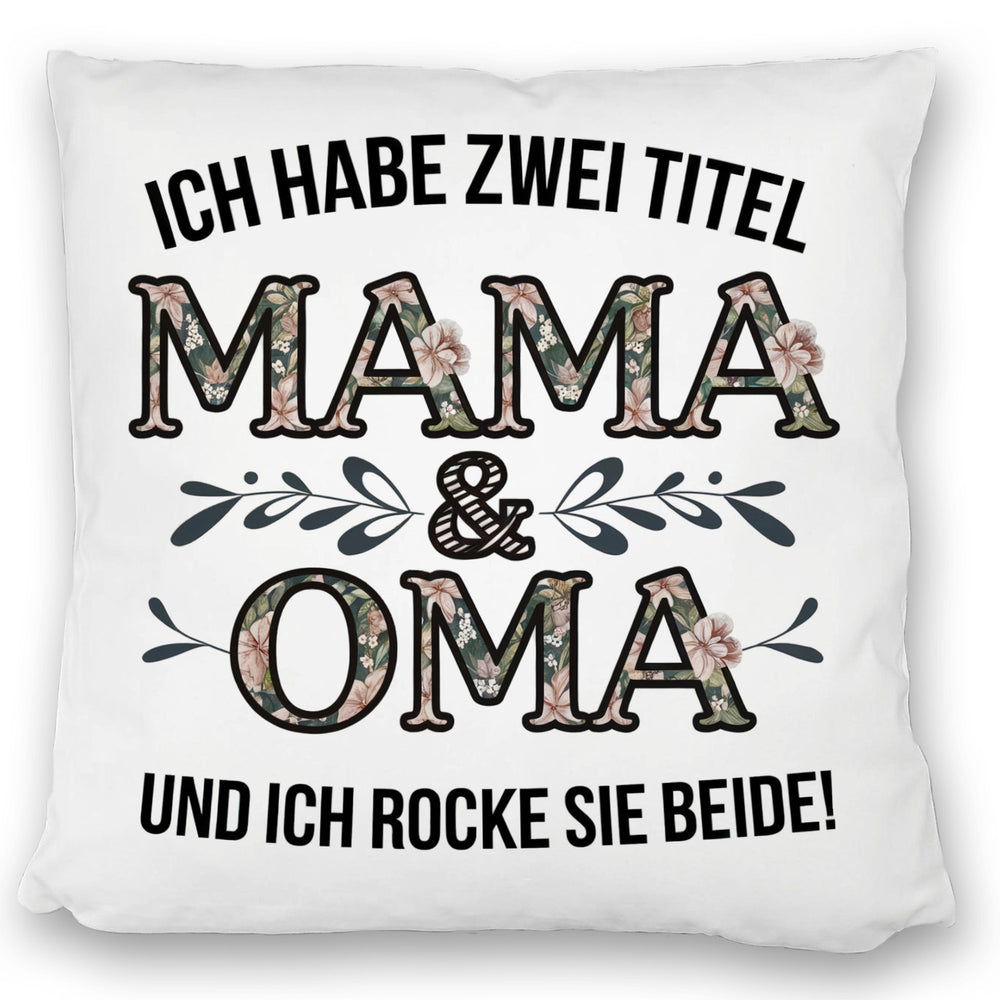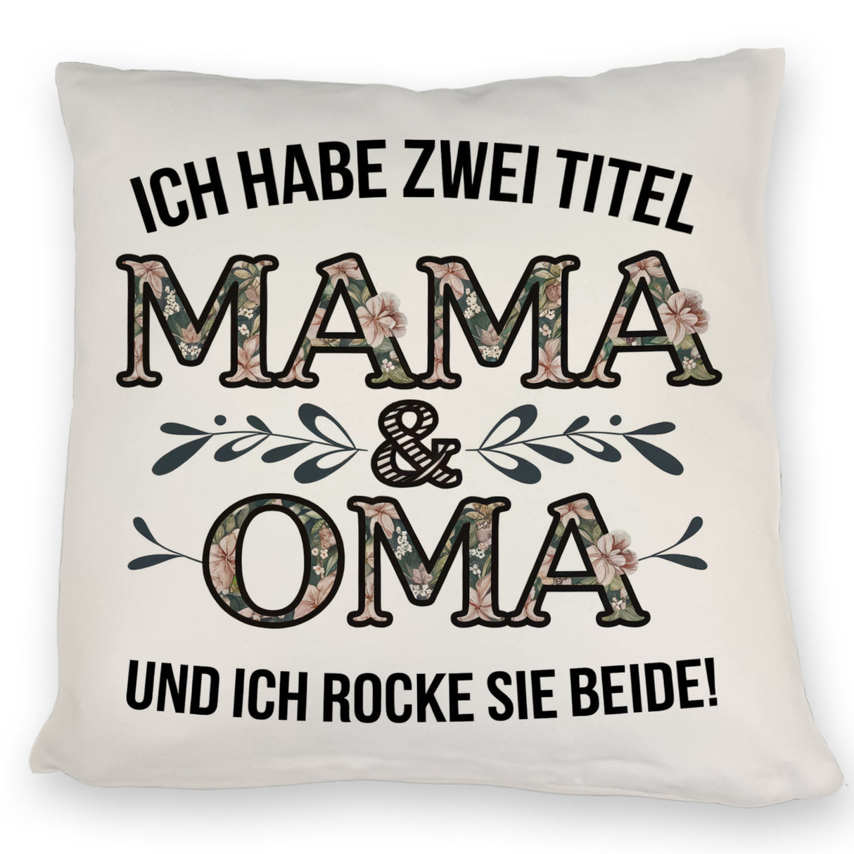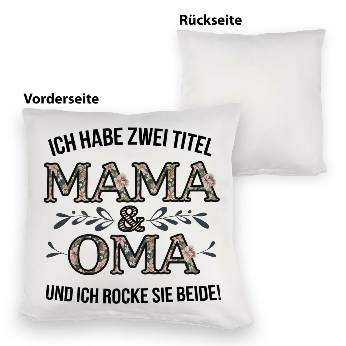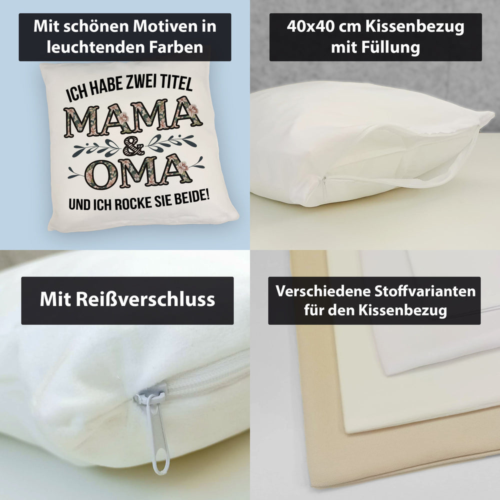 - 1x Ich habe zwei Titel Mama und Oma und ich rocke sie beide Kissen in der gewählten Ausführung