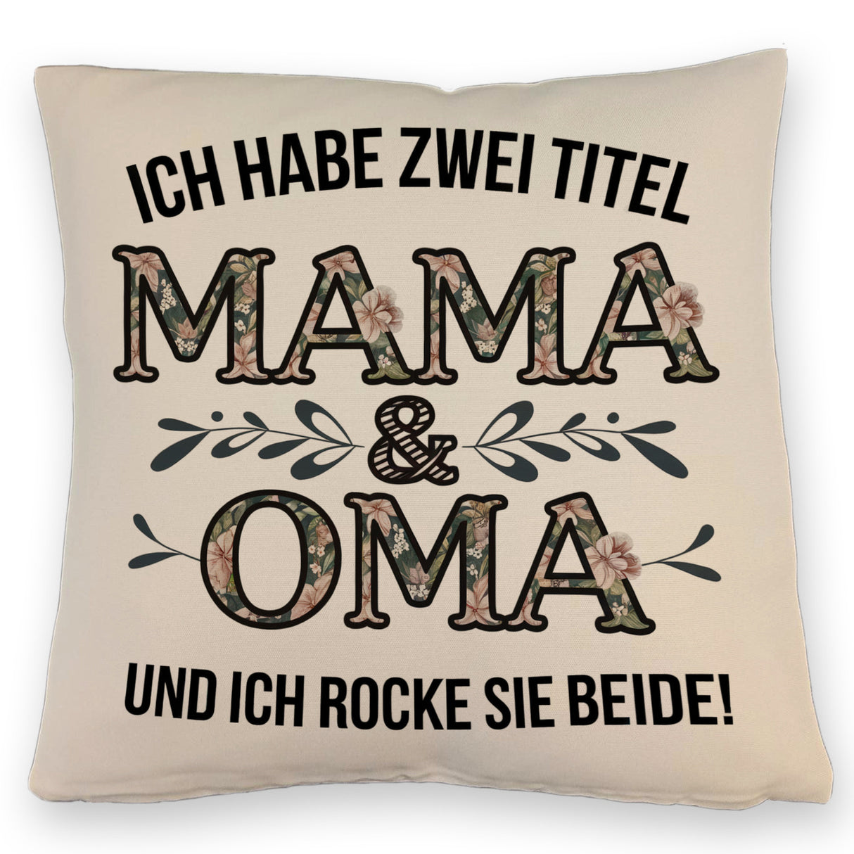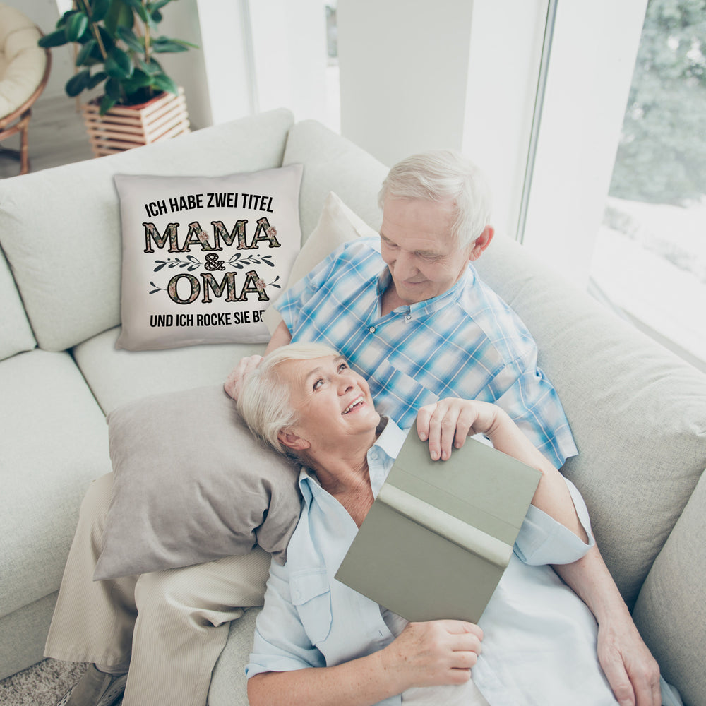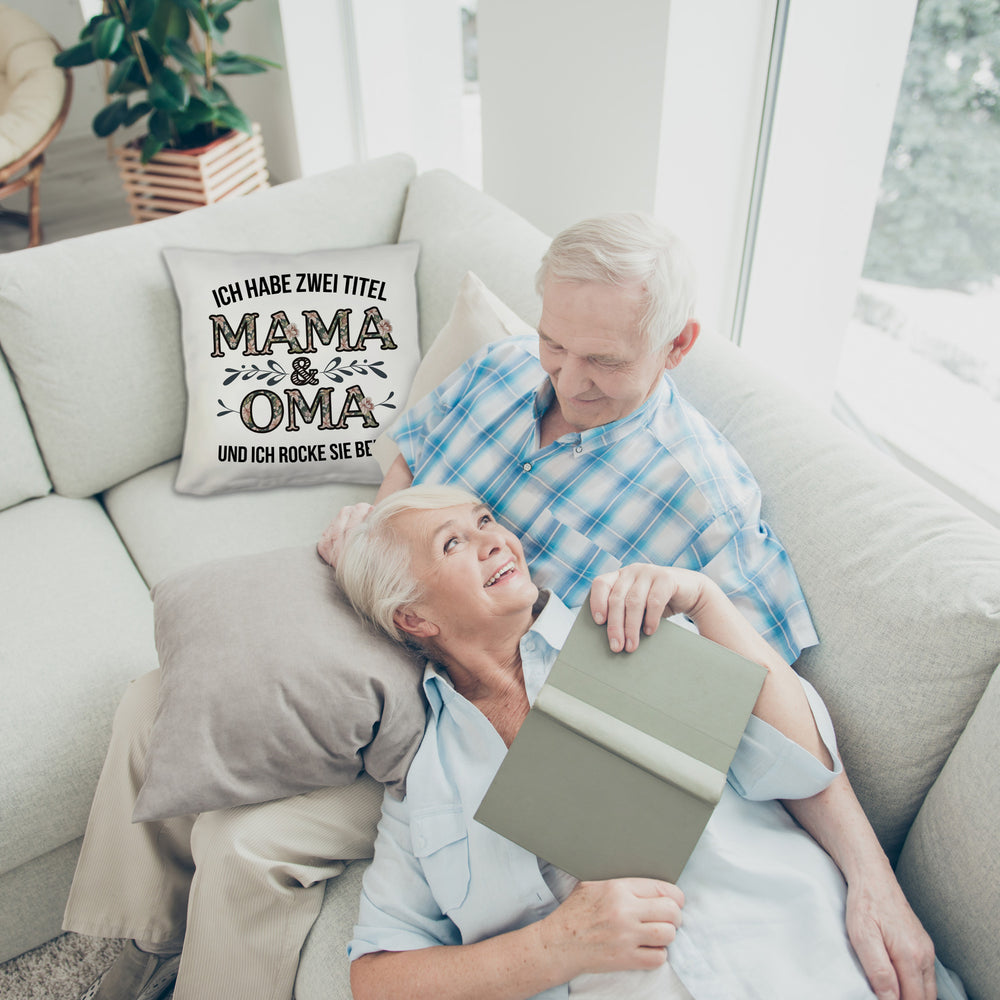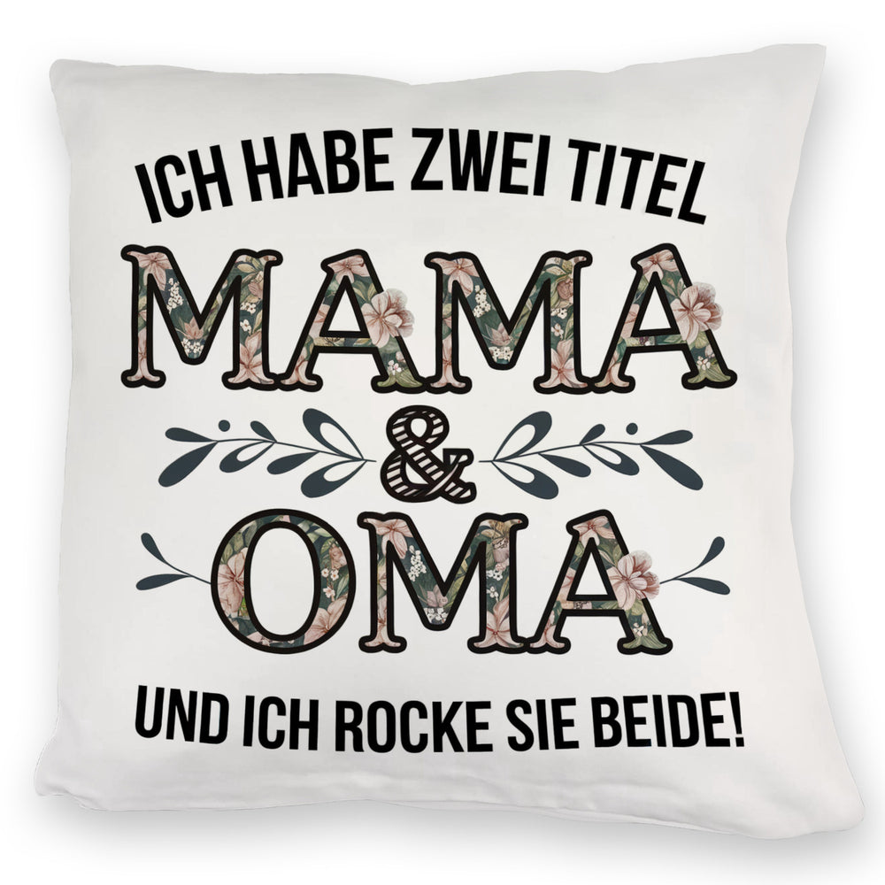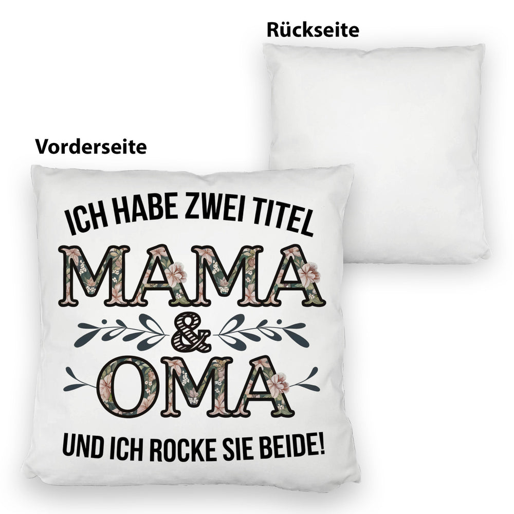 - 1x Ich habe zwei Titel Mama und Oma und ich rocke sie beide Kissen in der gewählten Ausführung