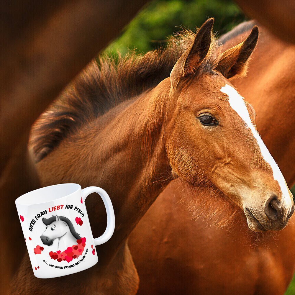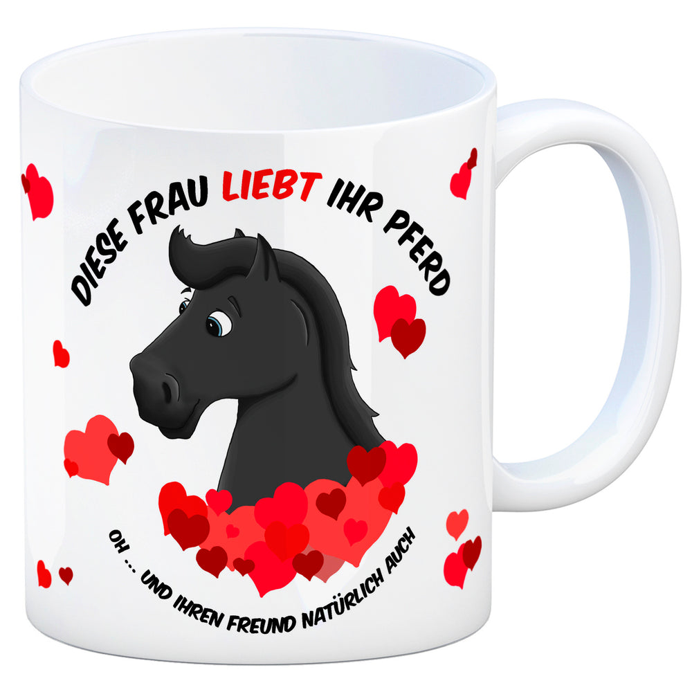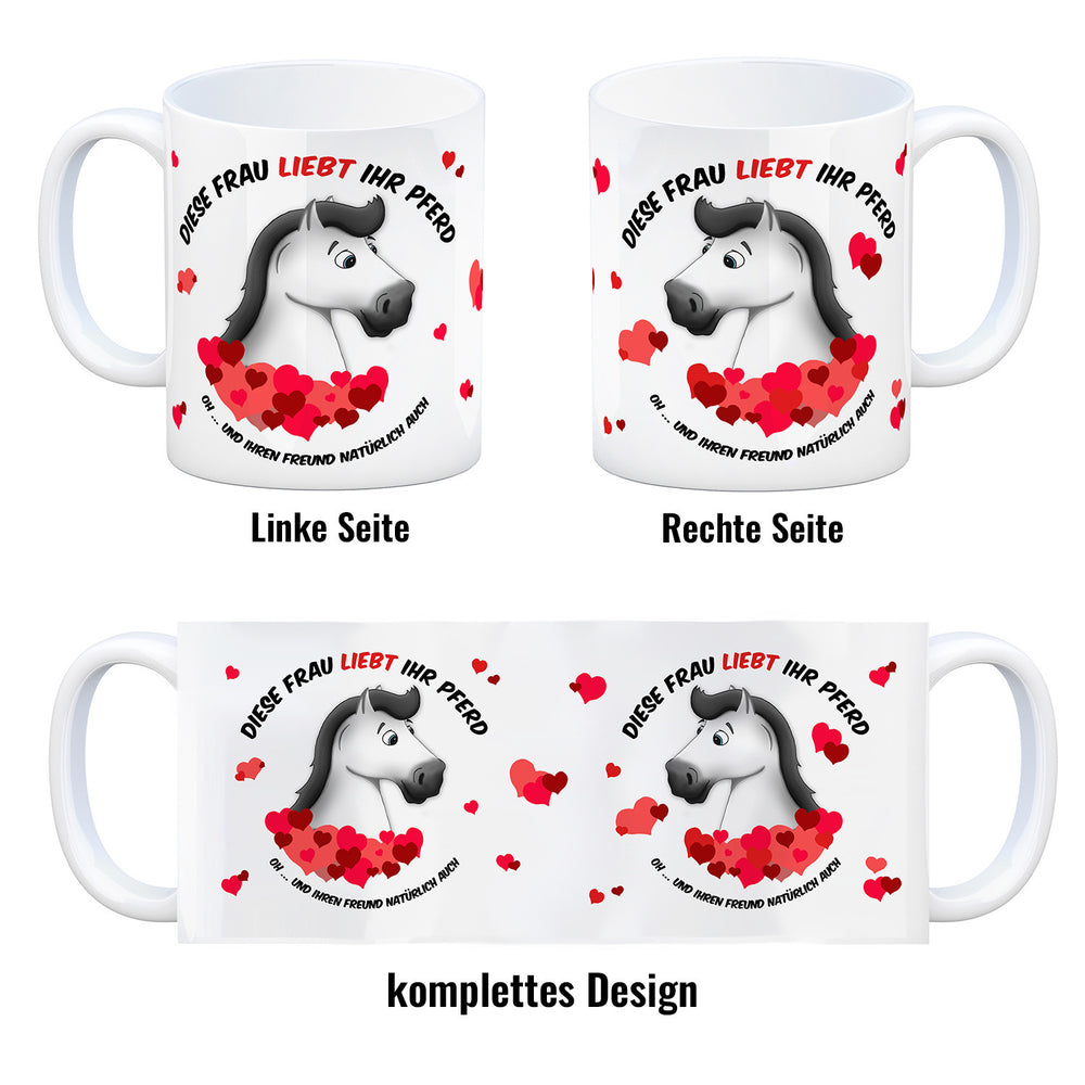 - 1x Kaffeebecher mit weißes Pferd Motiv und Spruch: Diese Frau liebt ihr Pferd. Oh ... in der gewählten Ausführung