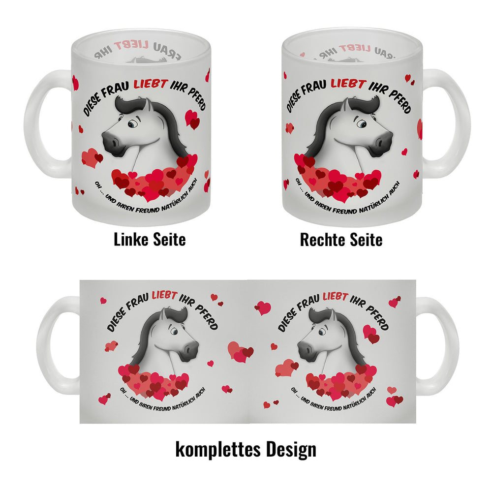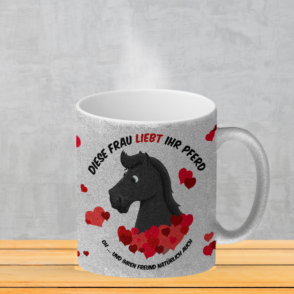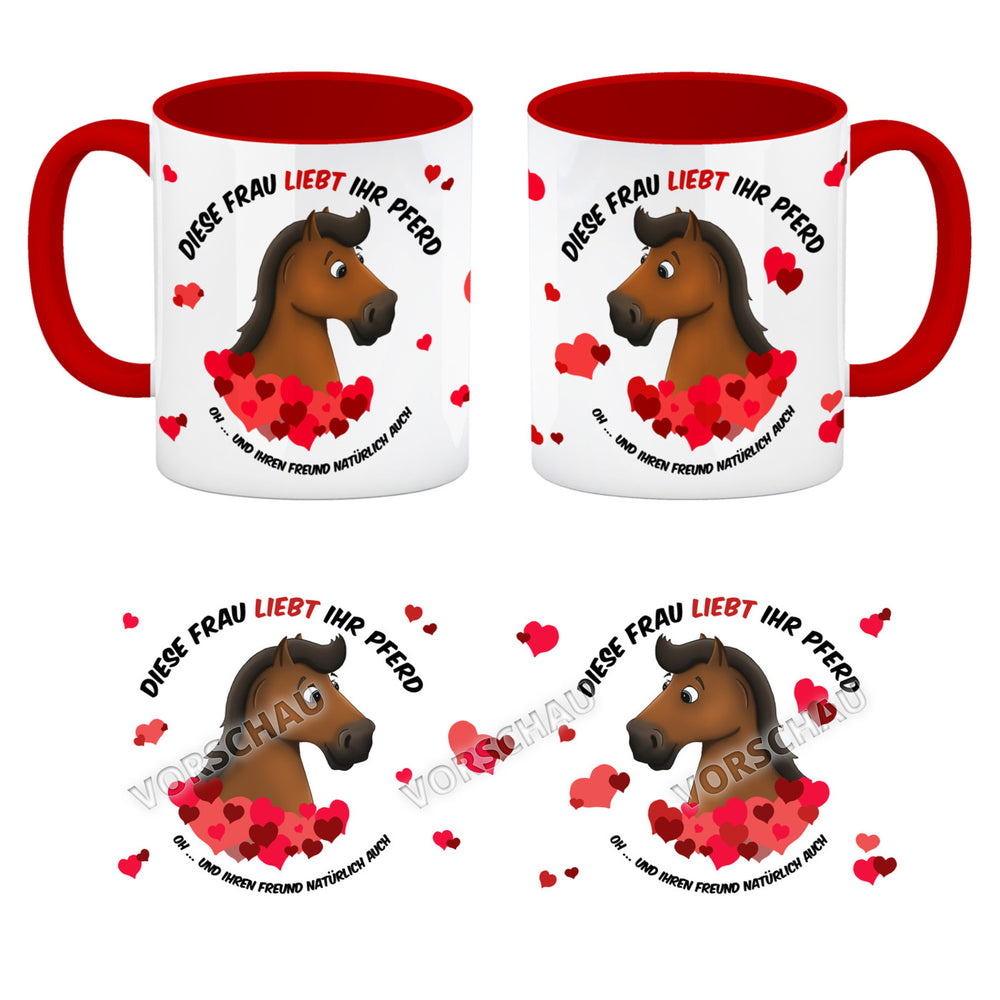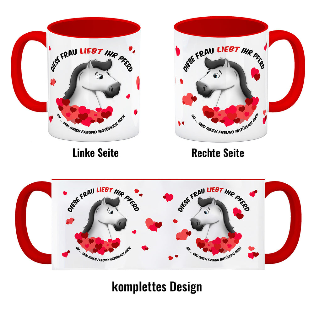 - 1x Kaffeebecher mit weißes Pferd Motiv und Spruch: Diese Frau liebt ihr Pferd. Oh ... in der gewählten Ausführung