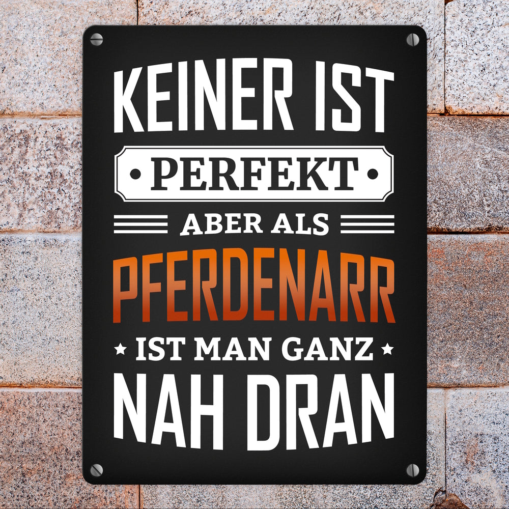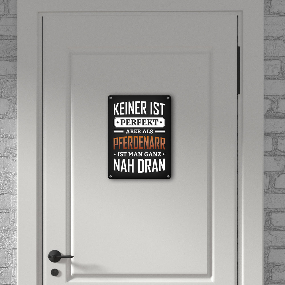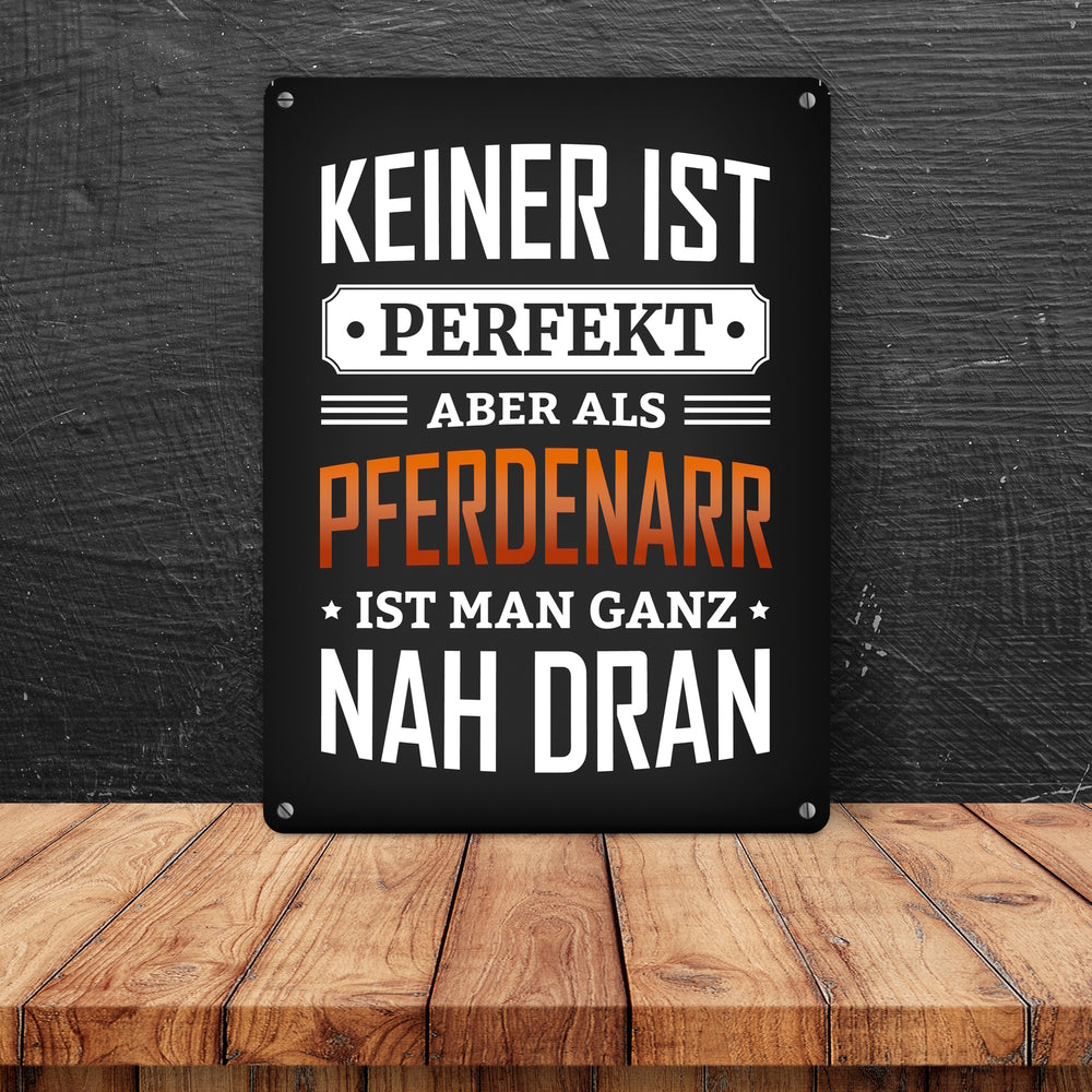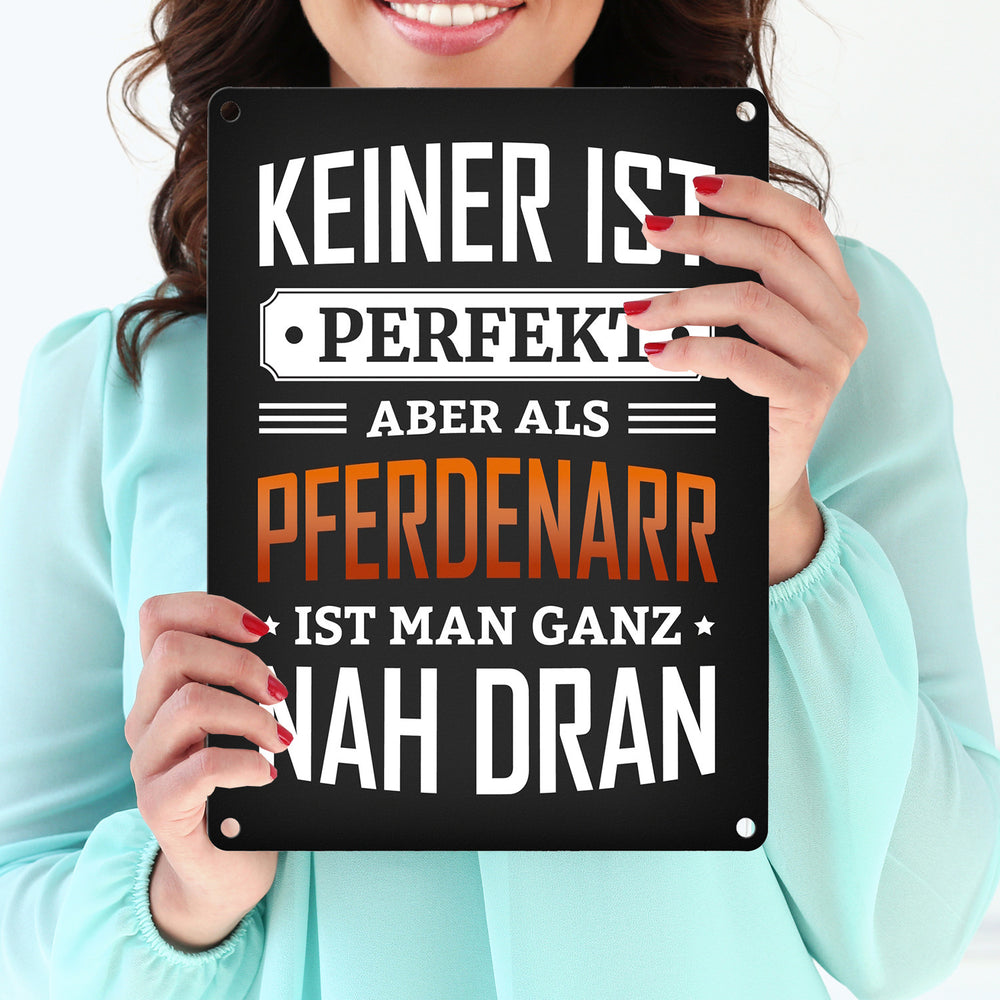- 1x Metallschild mit Spruch: Keiner ist perfekt, aber als Pferdenarr ist man ganz nah dran in der gewählten Größe