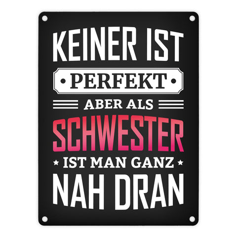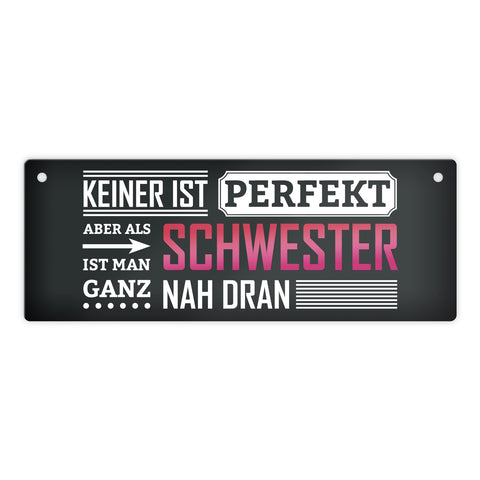 Metallschild mit Spruch: Keiner ist perfekt, aber als Schwester ist man ganz nah dran