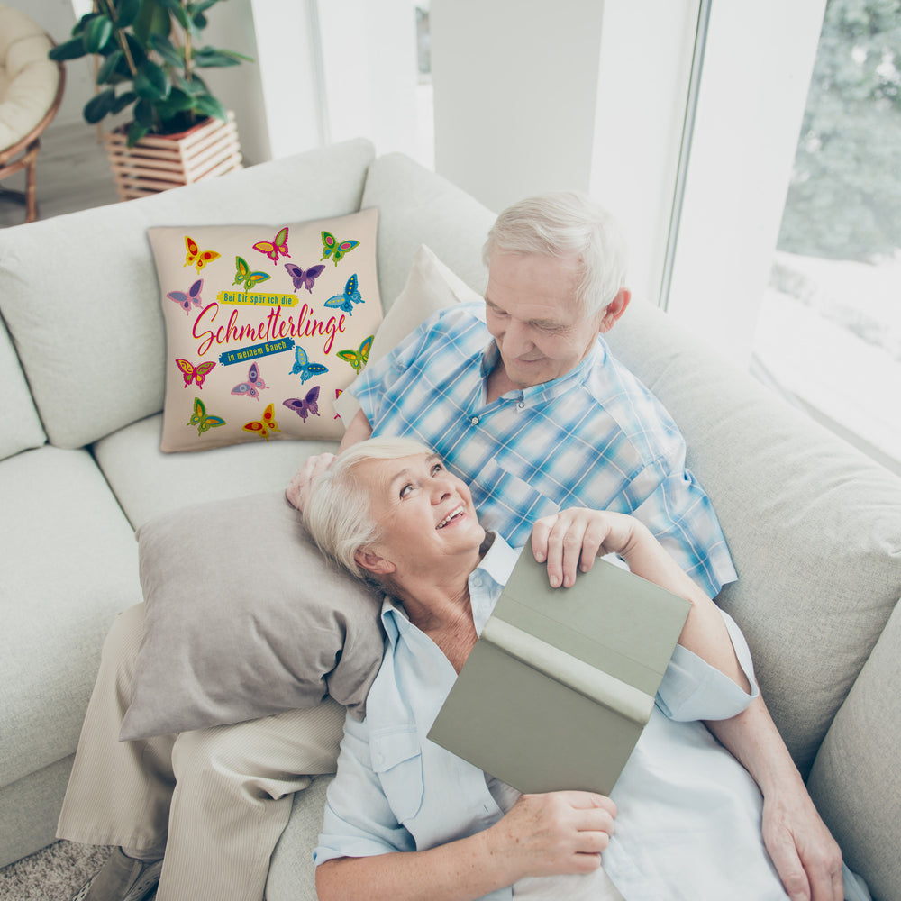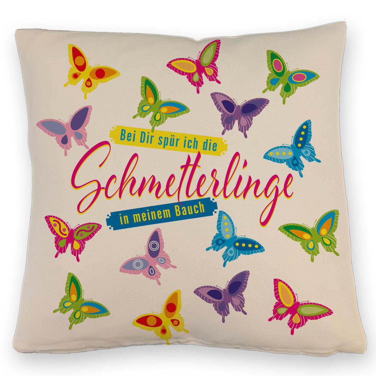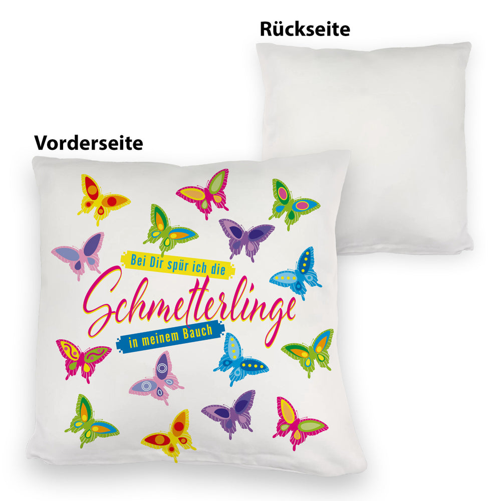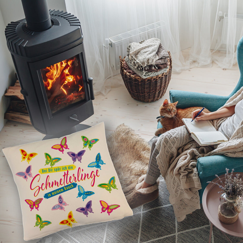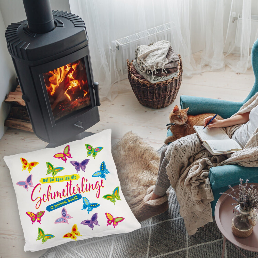 • Unser romantisches Kissen zeigt bunte Schmetterlinge, die über ein weiches, kunstvoll bedrucktes Kissen flattern. Der Spruch "Bei dir spür ich die Schmetterlinge in meinem Bauch" verleiht dem Kissen eine liebevolle Note. Perfekt für alle, die ein bisschen Frühlingsgefühle ins Wohnzimmer oder auf das Sofa bringen möchten.