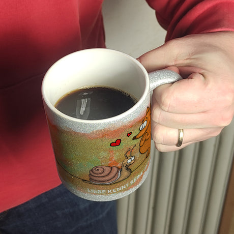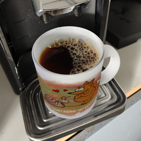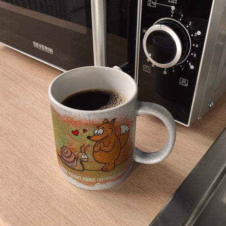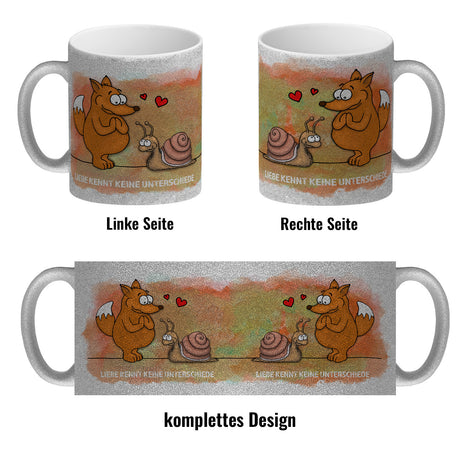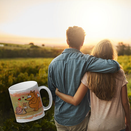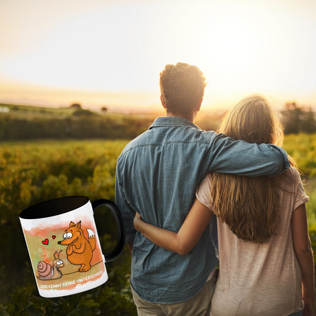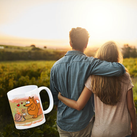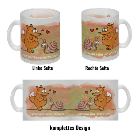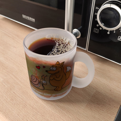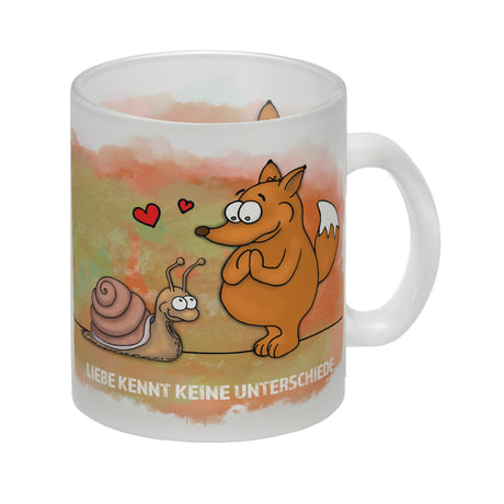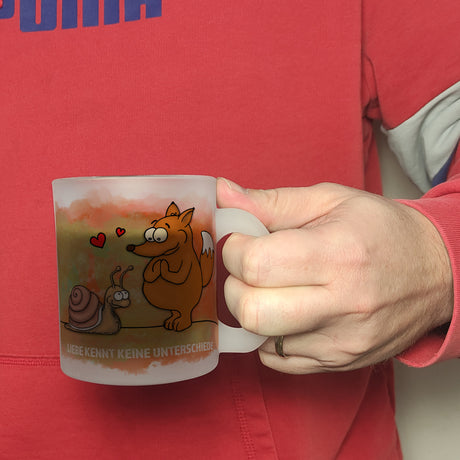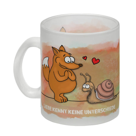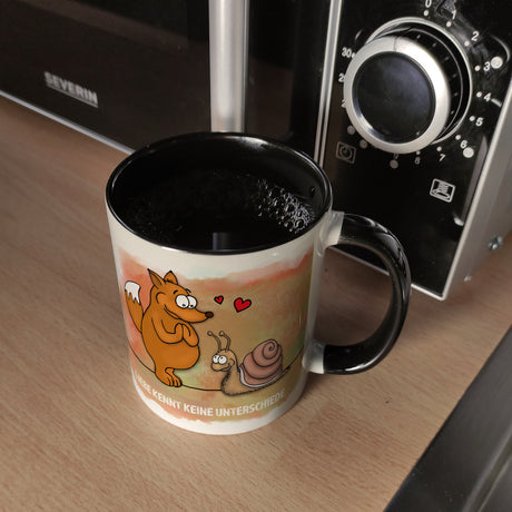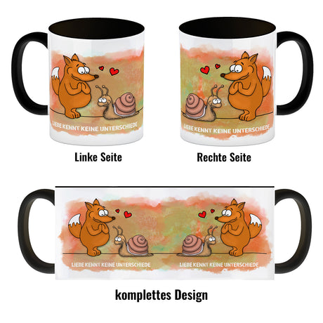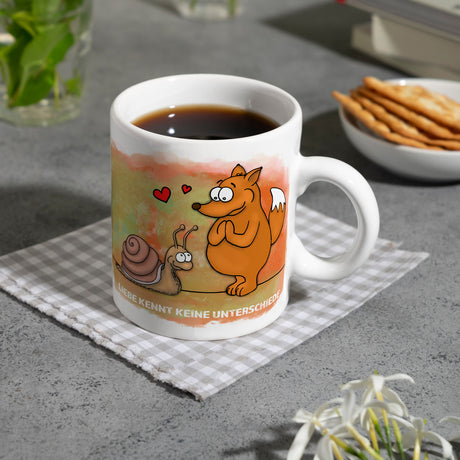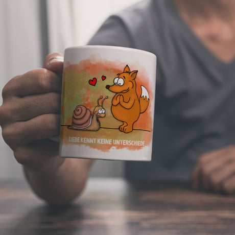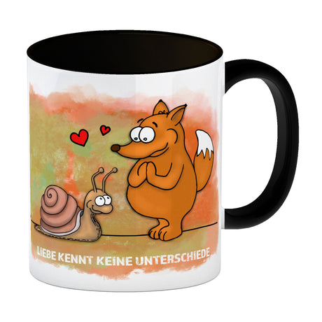 Kaffeebecher mit Fuchs und Schnecke Motiv und Spruch: Liebe kennt keine Unterschiede