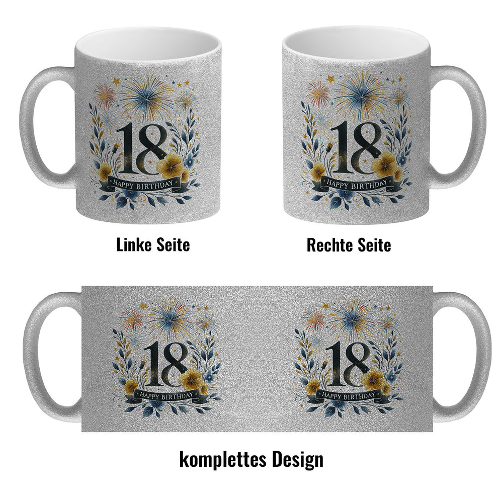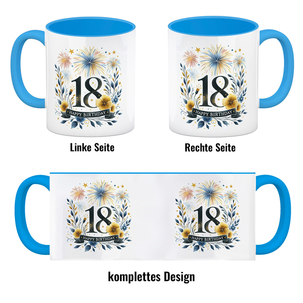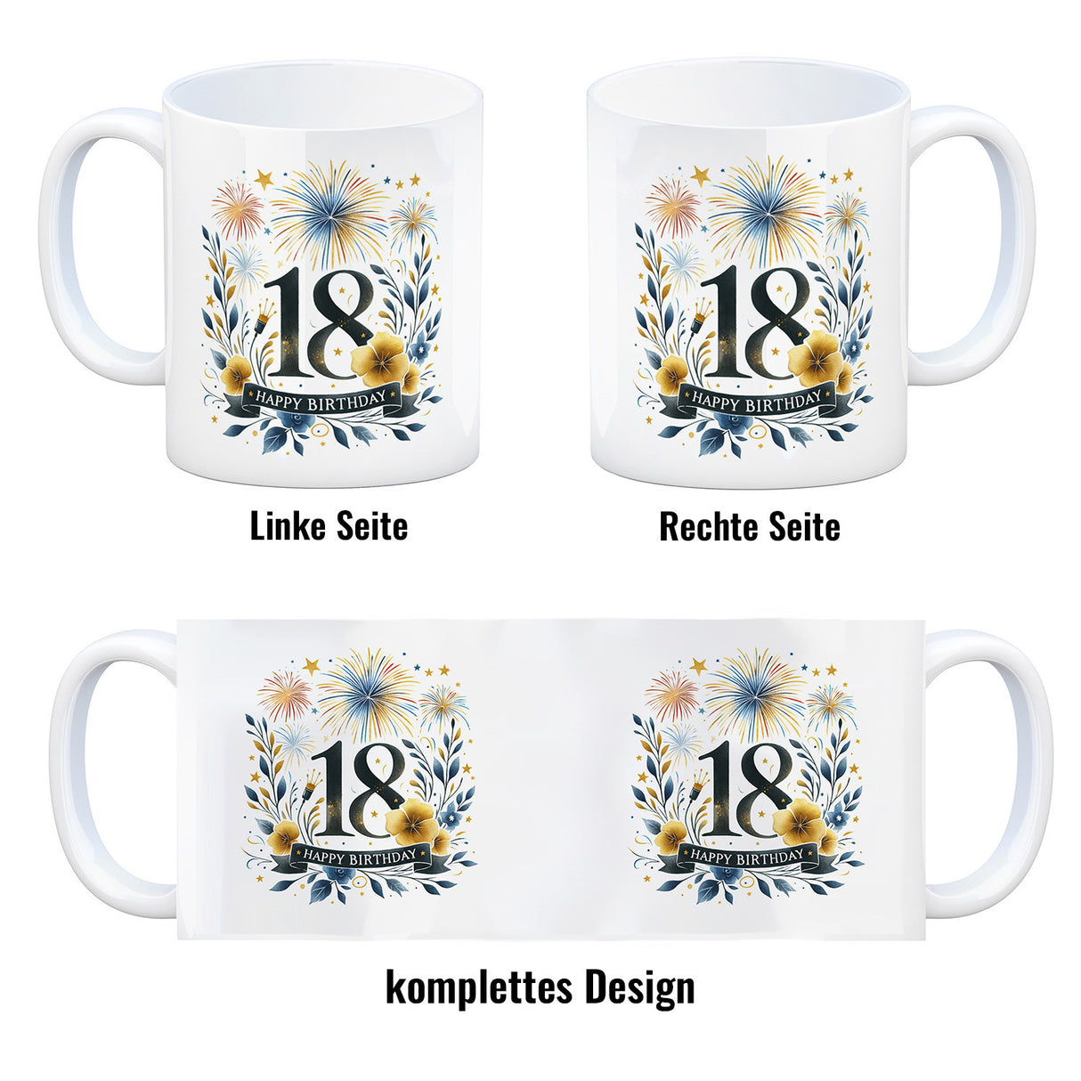 - Frohe Tasse zum 18. Geburtstag! Dieser Kaffeebecher bringt Farbe in deinen Morgen – und wie! Mit einem spritzigen Happy Birthday 18-Spruch und einem Feuerwerk im Hintergrund ist er perfekt für den Start in dein Erwachsenenleben.