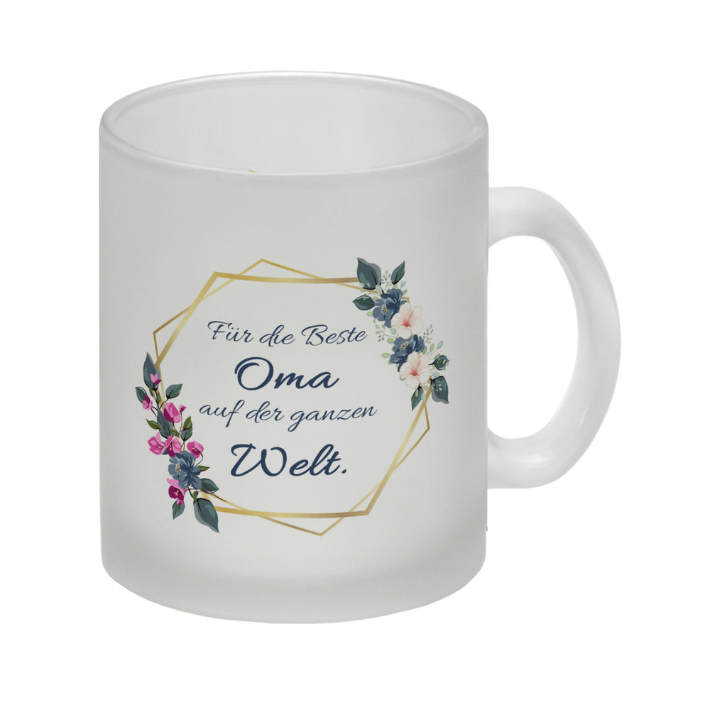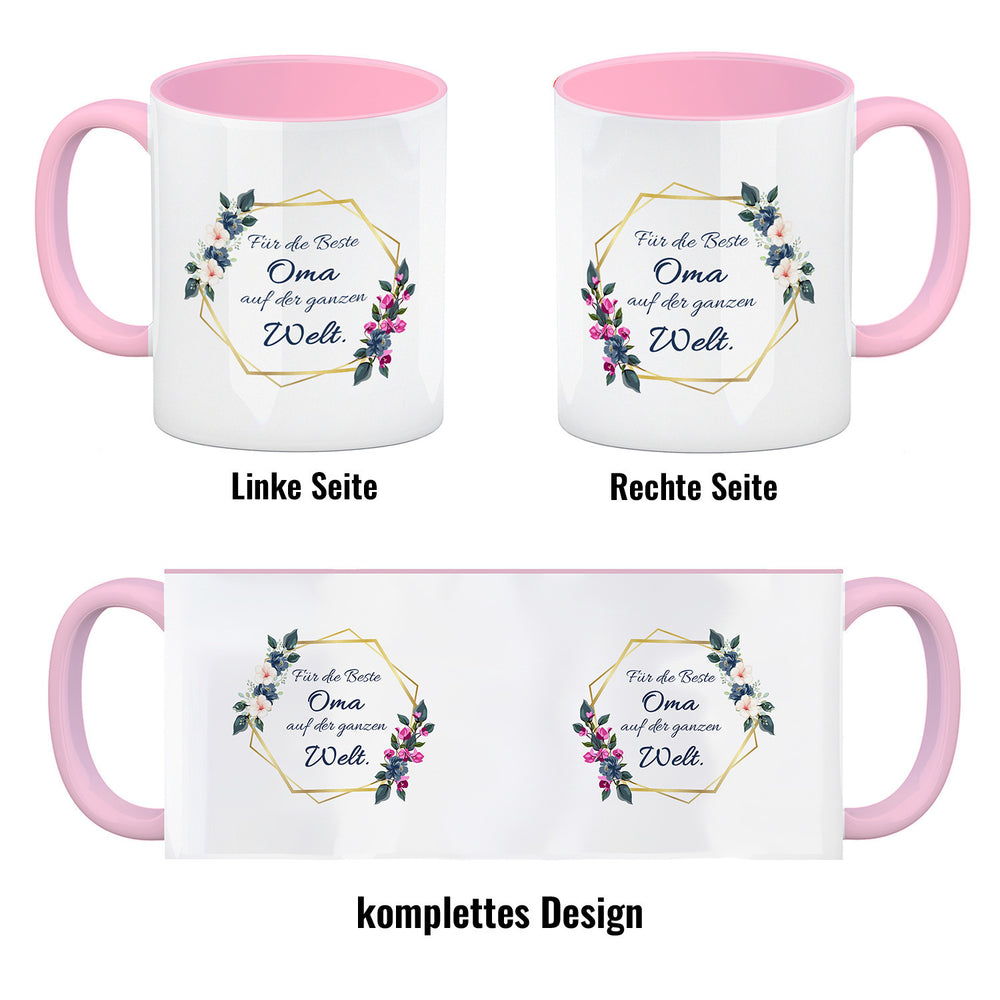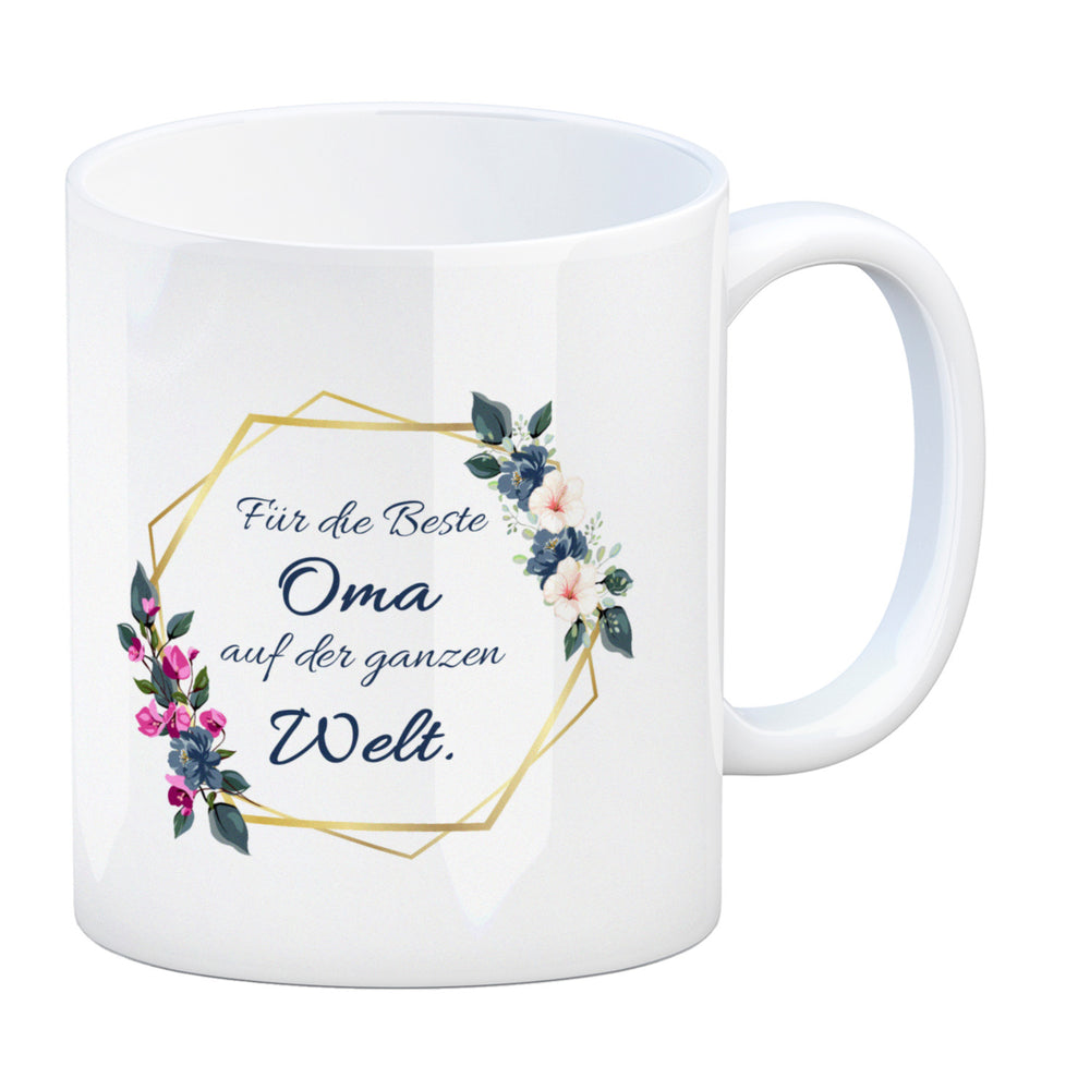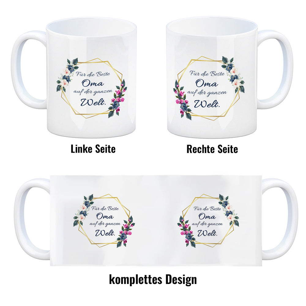 - 1x Für die Beste Oma auf der ganzen Welt Kaffeebecher mit Goldrahmen und Blumen in der gewählten Ausführung