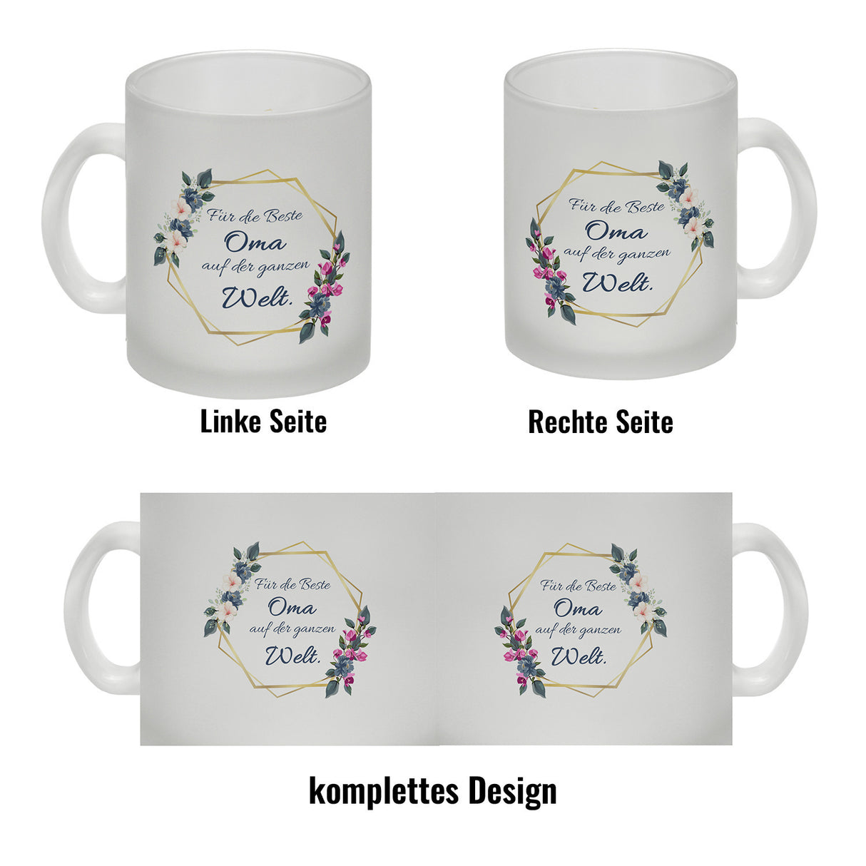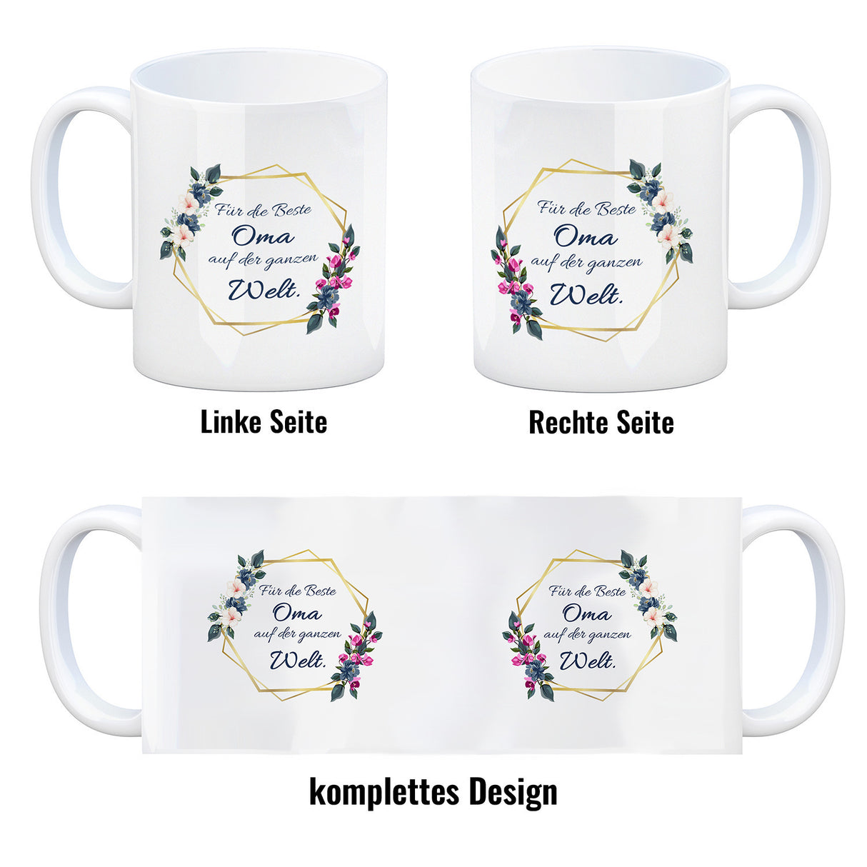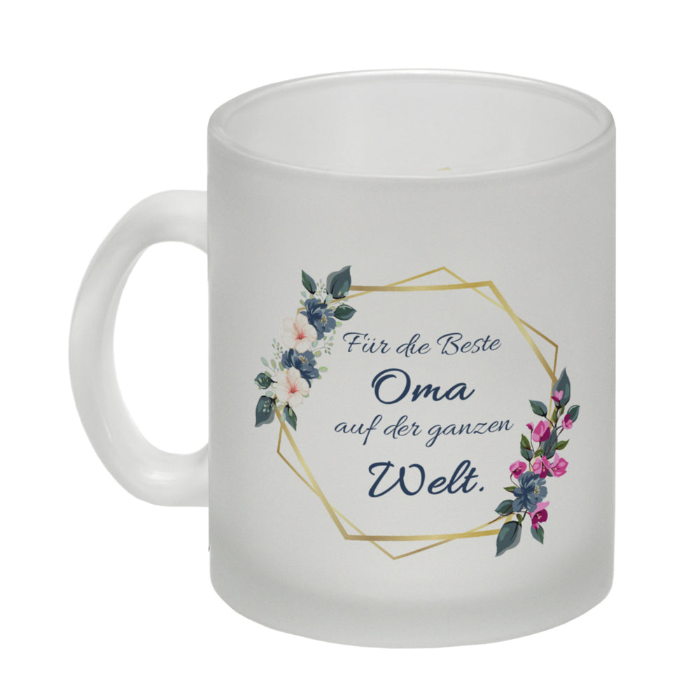 - 1x Für die Beste Oma auf der ganzen Welt Kaffeebecher mit Goldrahmen und Blumen in der gewählten Ausführung