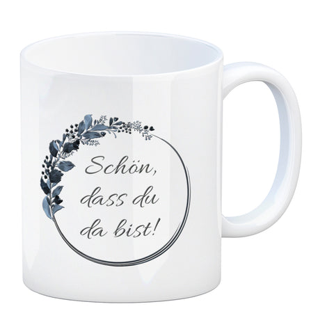 Schön, dass du da bist! Kaffeebecher mit Blumenkranz herrlich wunderbar Kaffeepott Trinkschale edel Gebinde Bukett Strauß Blumen Bouquet Spruch Slogan Sinnspruch Lebensregel