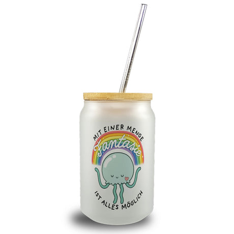 Jelly & Friends Qualle Trinkglas mit Bambusdeckel mit Spruch Mit Fantasie ist alles möglich