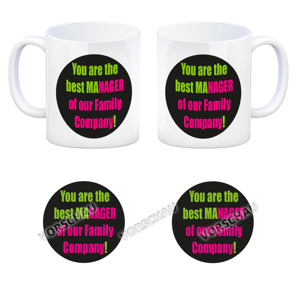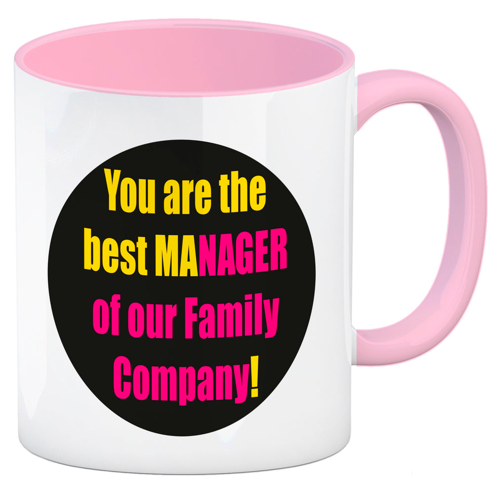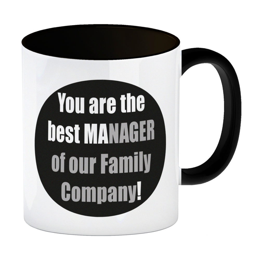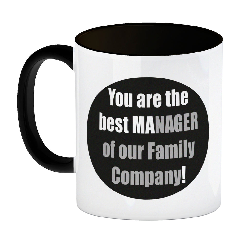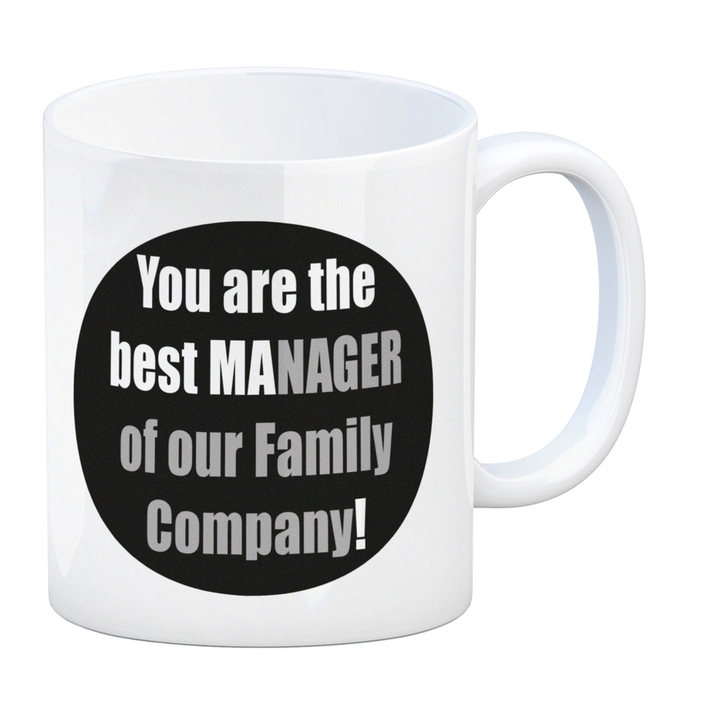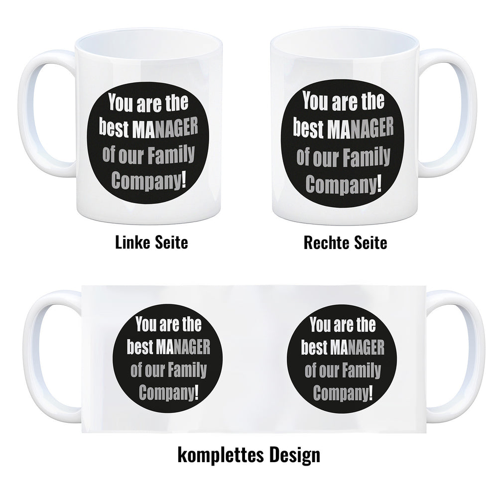 - 1x Manager of our Family Kaffeebecher mit Spruch für Mama zum Muttertag in der gewählten Ausführung