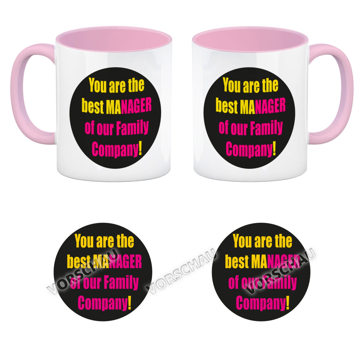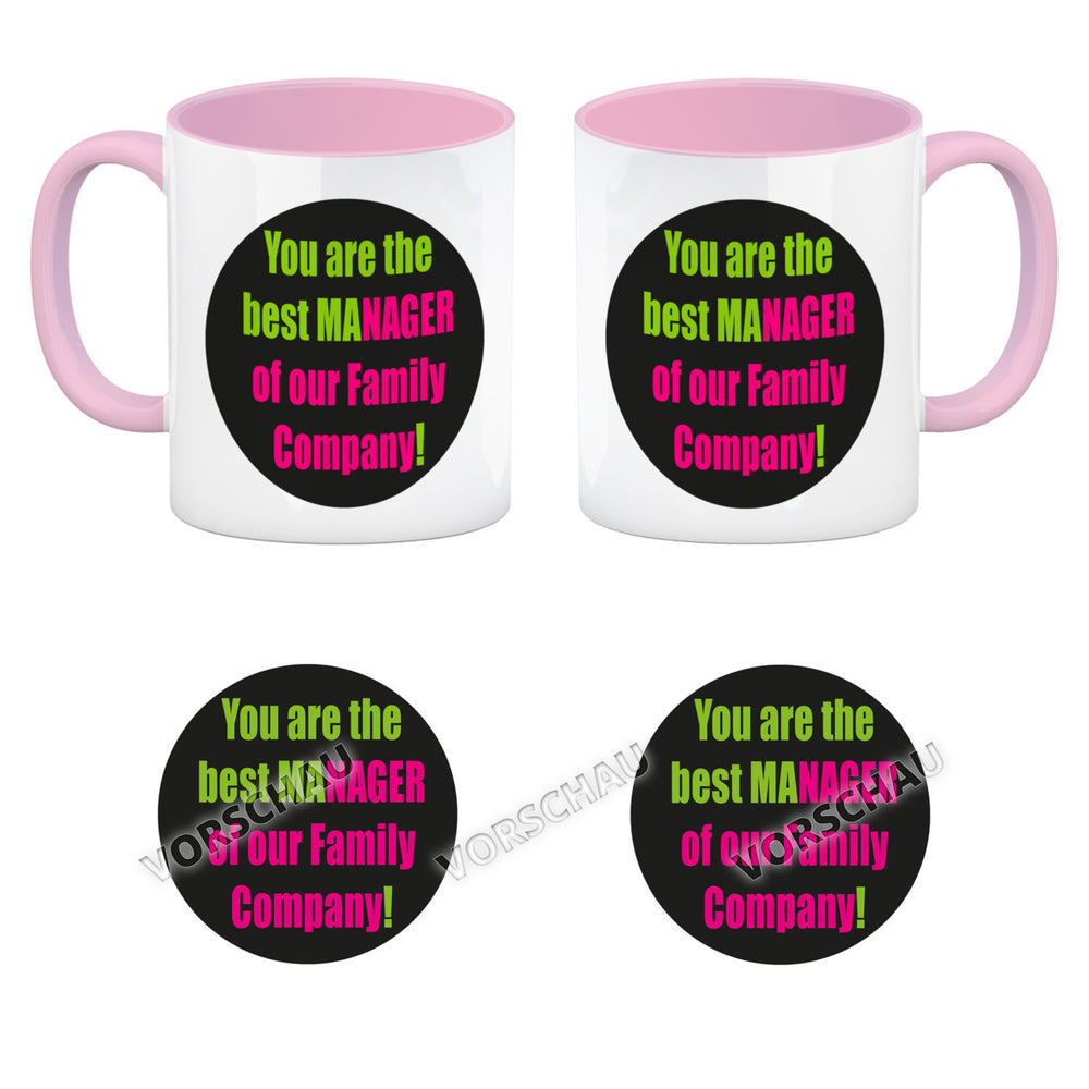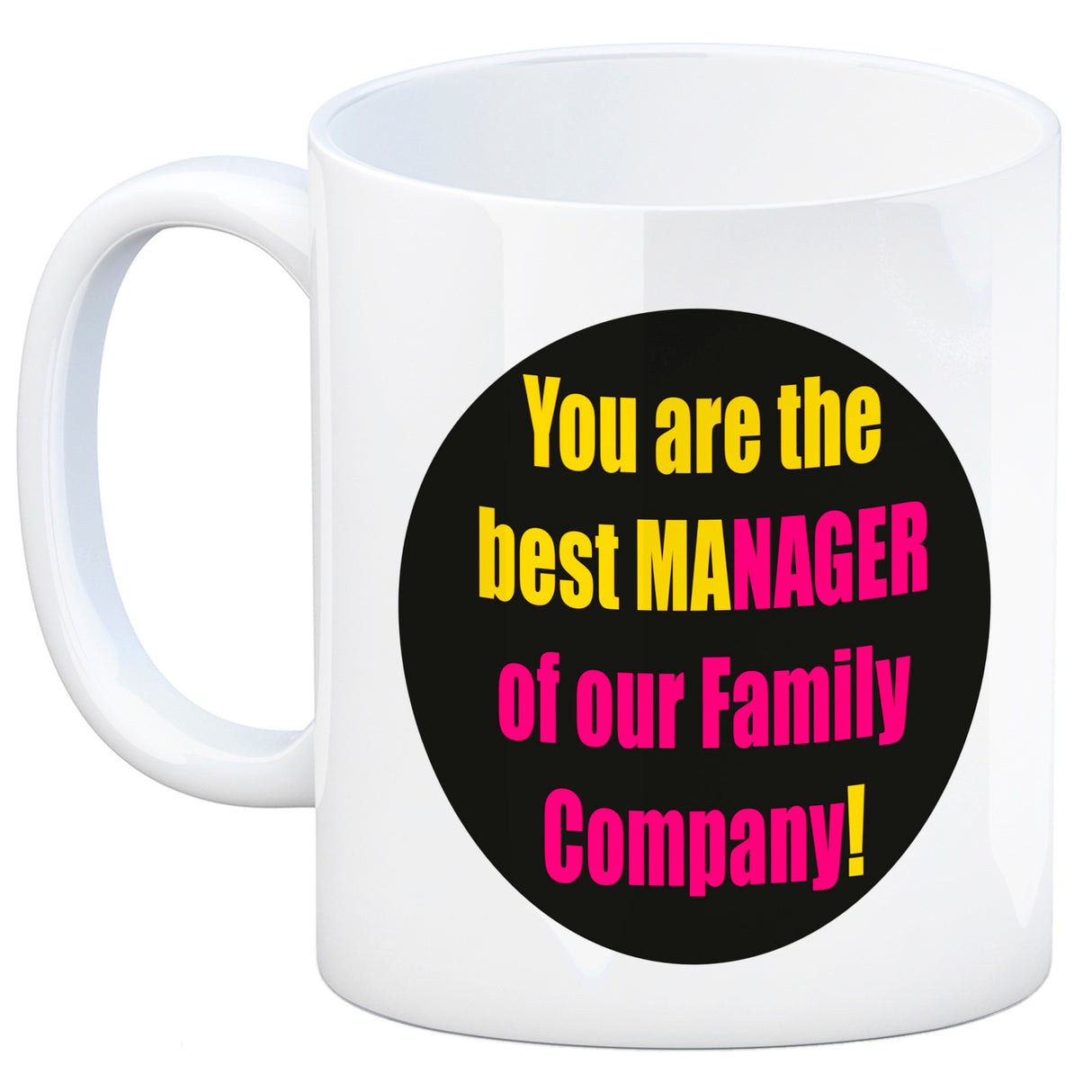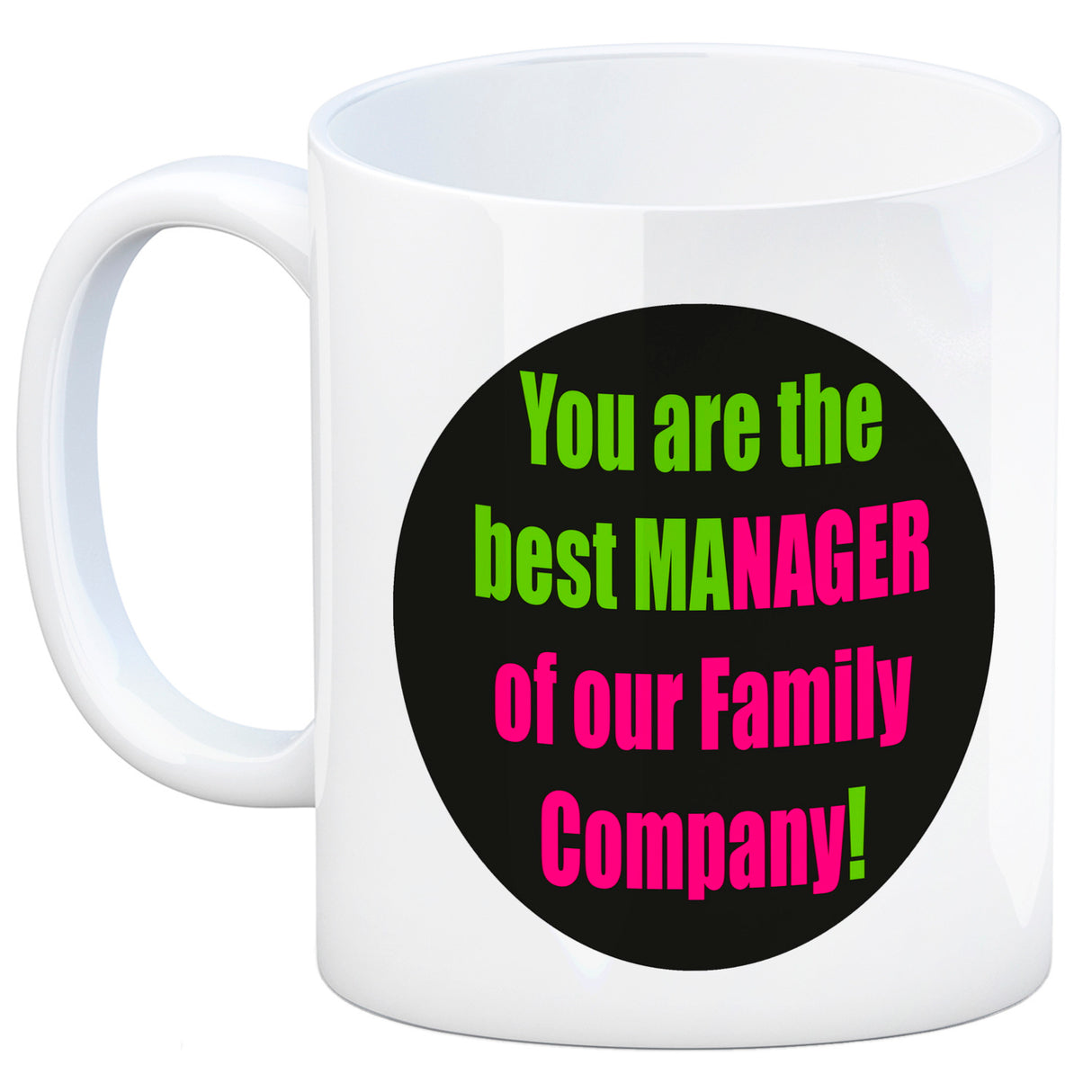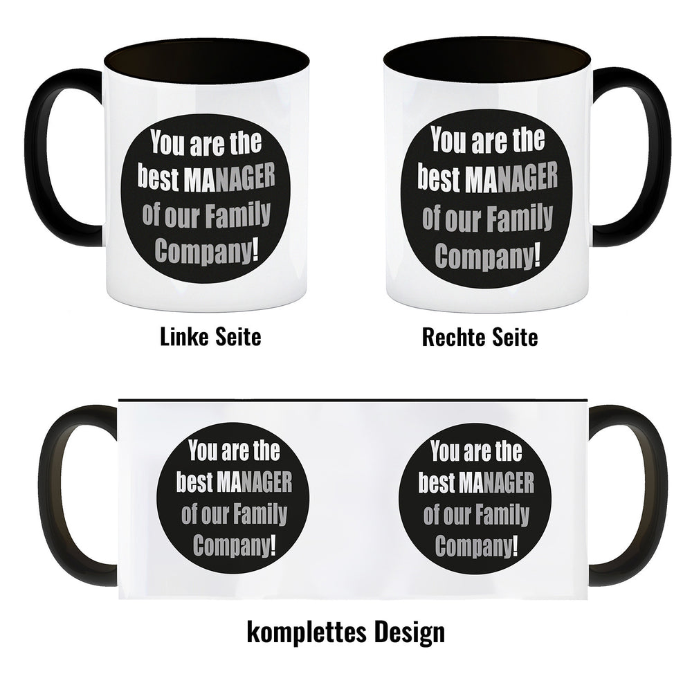 - 1x Manager of our Family Kaffeebecher mit Spruch für Mama zum Muttertag in der gewählten Ausführung