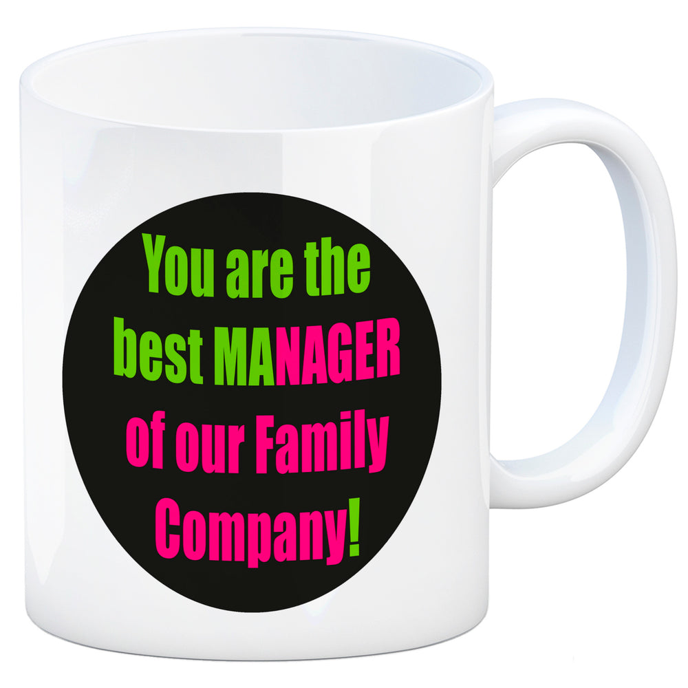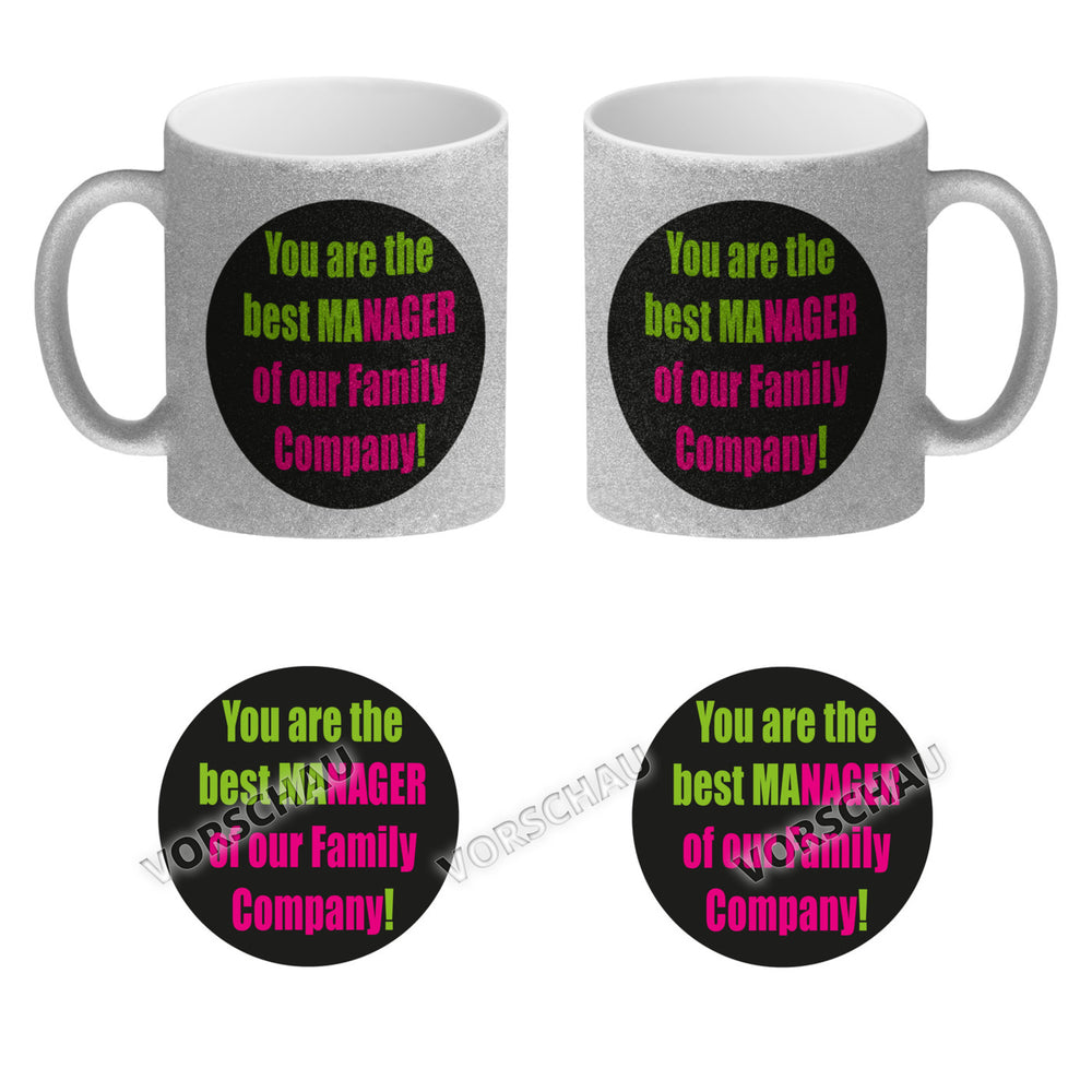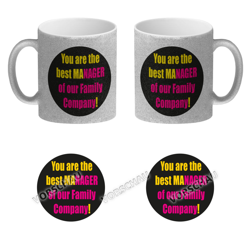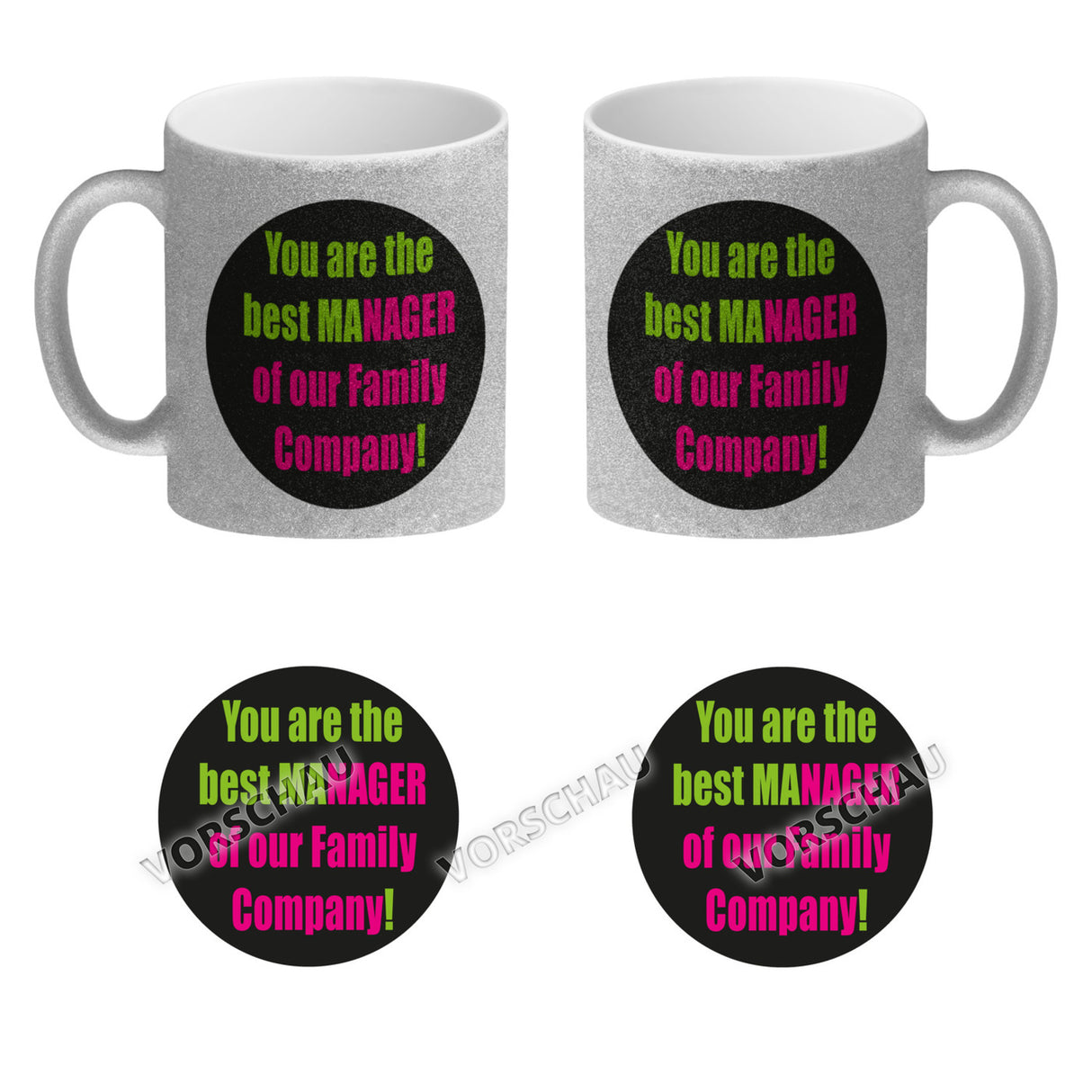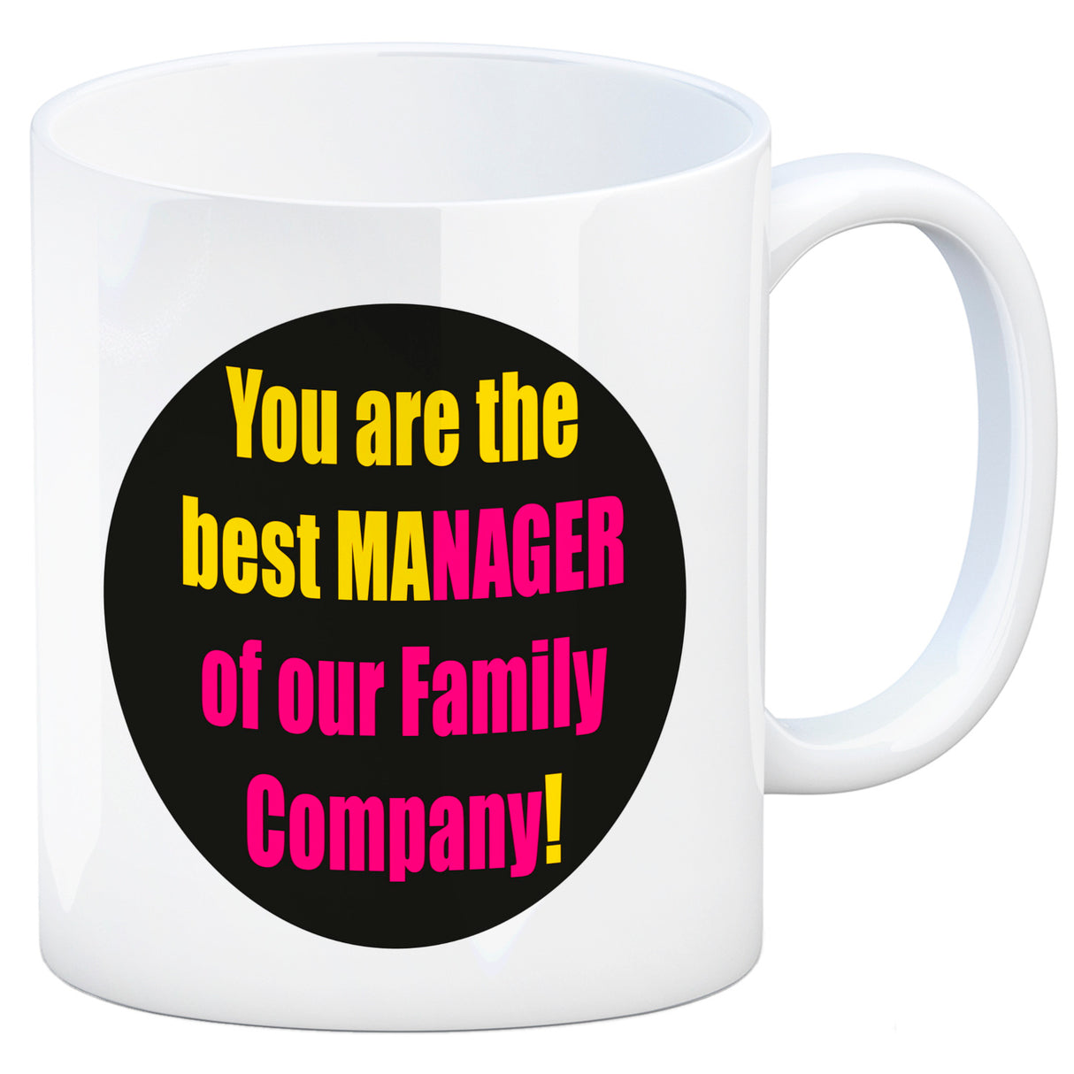 - 1x Manager of our Family Kaffeebecher mit Spruch für Mama zum Muttertag in der gewählten Ausführung
