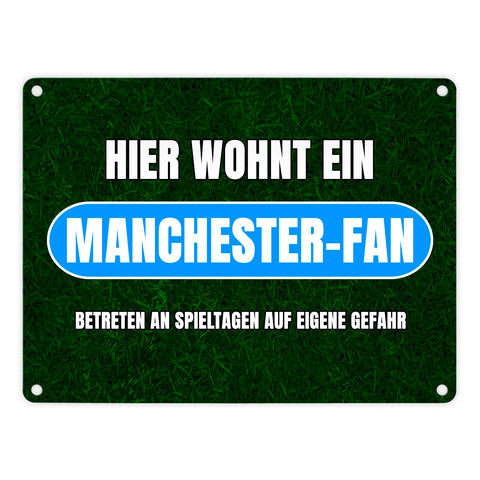 Hier wohnt ein Manchester-Fan Metallschild in 15x20 cm mit Rasenmotiv