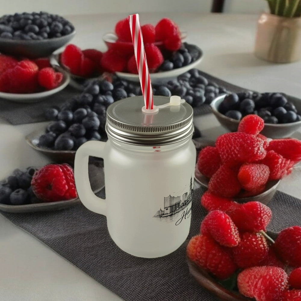 • 1x Skyline Hamburg Stadtsilhouette Trinkglas mit Bambusdeckel mit Bambusdeckel oder Henkel
