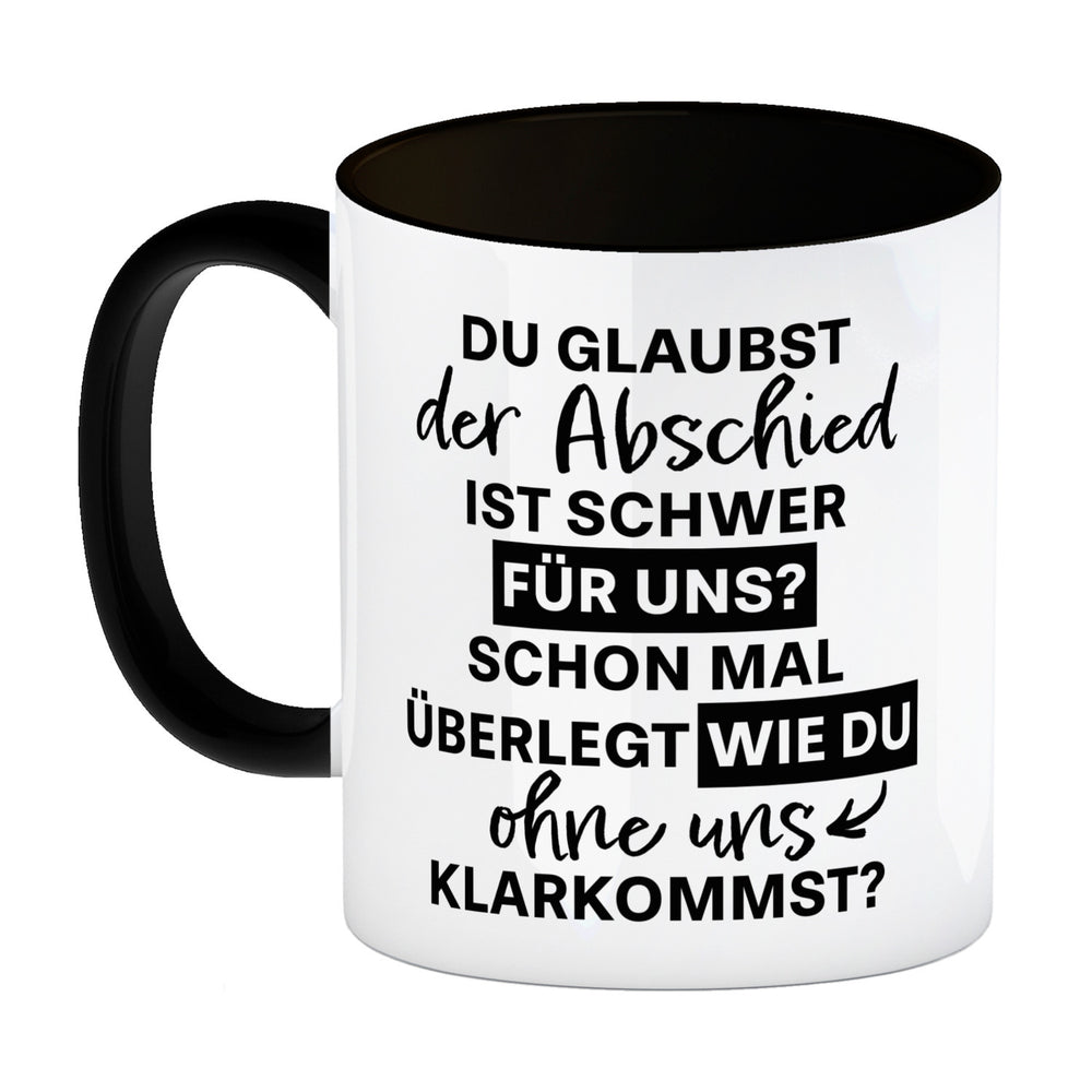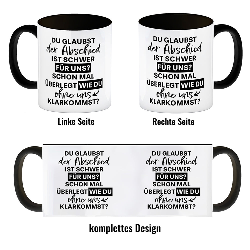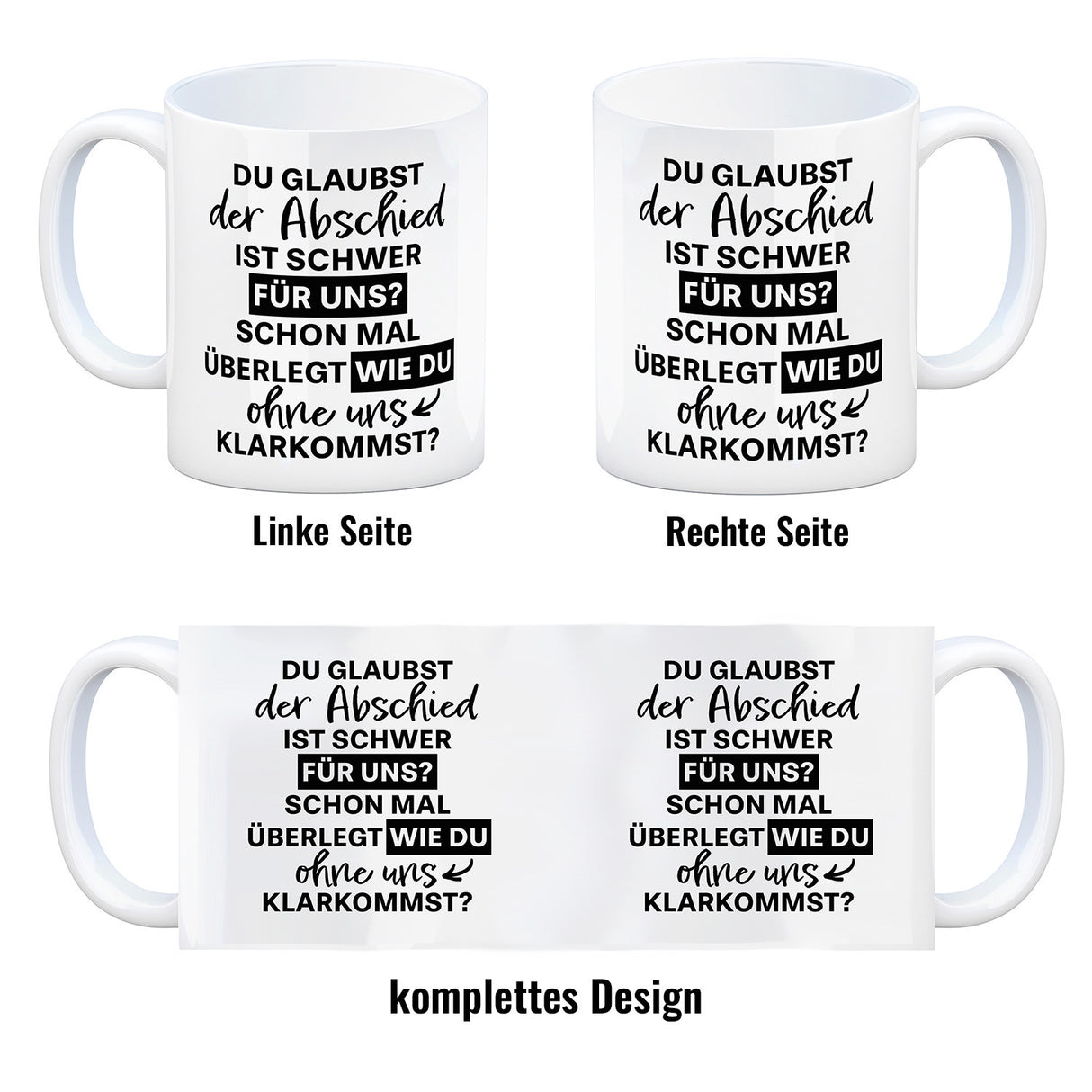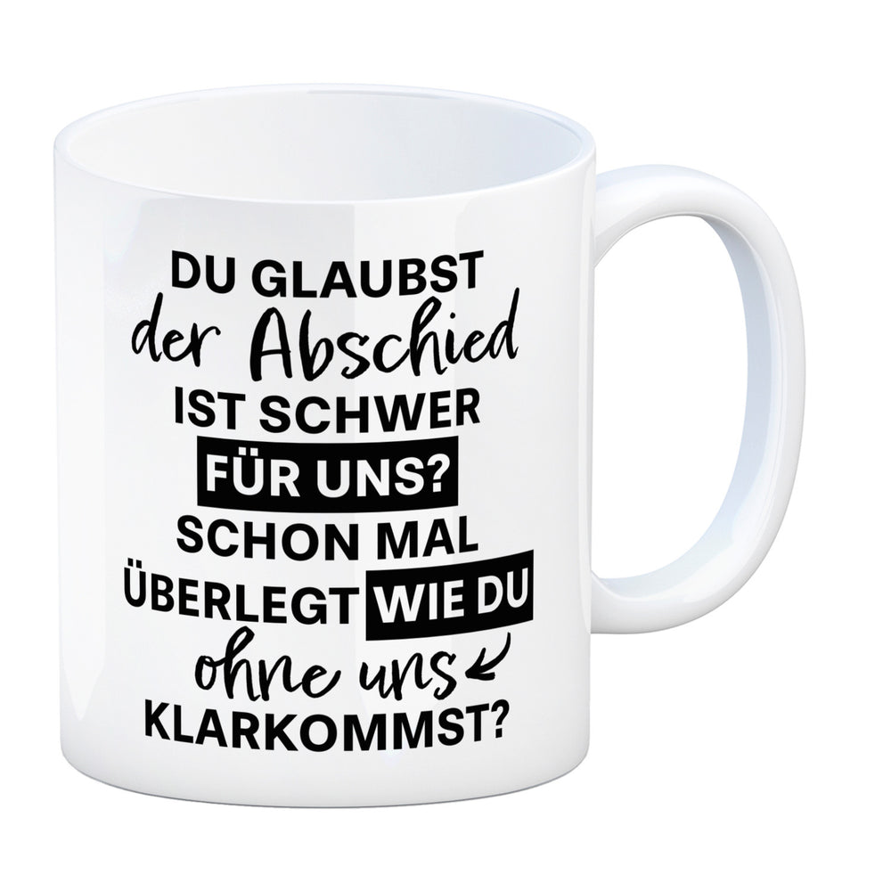 - Dieser Kaffeebecher ist das perfekte Abschiedsgeschenk für deinen Kollegen! Mit dem lustigen Spruch "Du glaubst, der Abschied ist schwer für uns? Schon mal überlegt, wie du ohne uns klarkommst?" bringt er garantiert alle zum Schmunzeln.