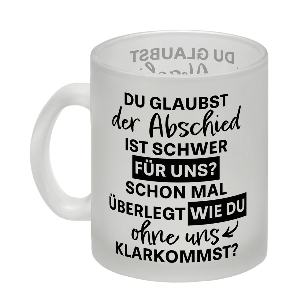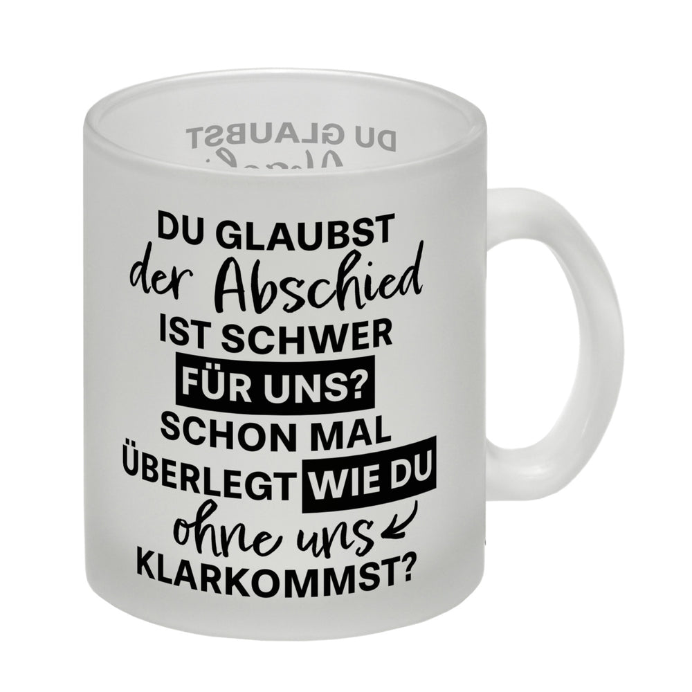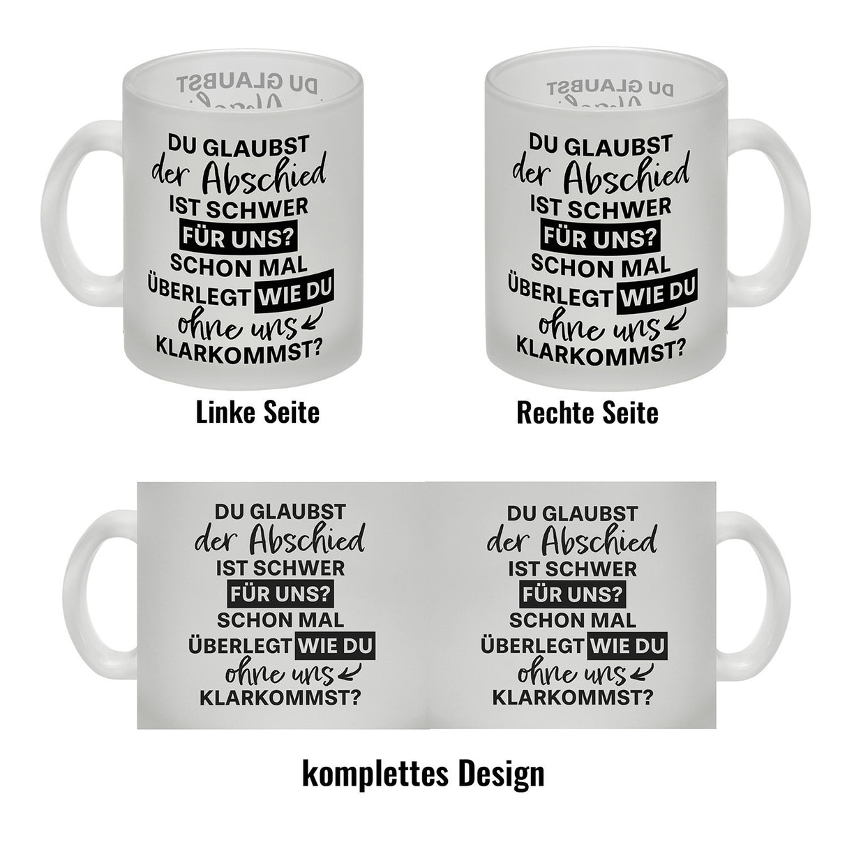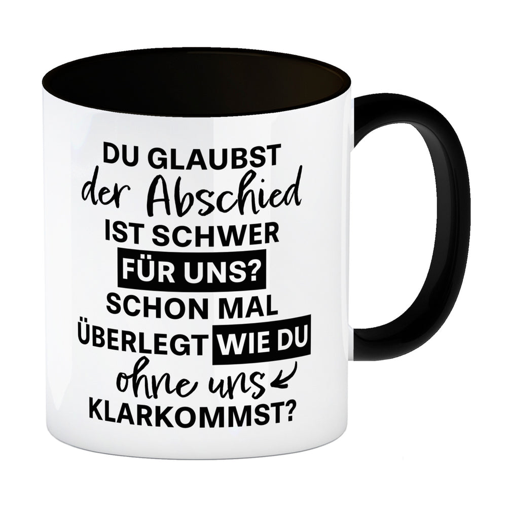 - Dieser Kaffeebecher ist das perfekte Abschiedsgeschenk für deinen Kollegen! Mit dem lustigen Spruch "Du glaubst, der Abschied ist schwer für uns? Schon mal überlegt, wie du ohne uns klarkommst?" bringt er garantiert alle zum Schmunzeln.