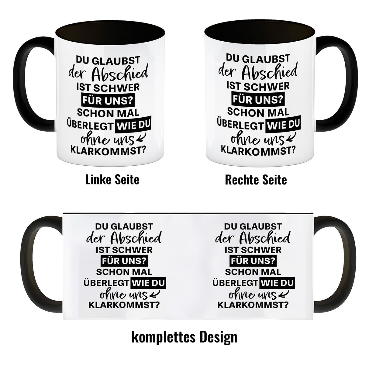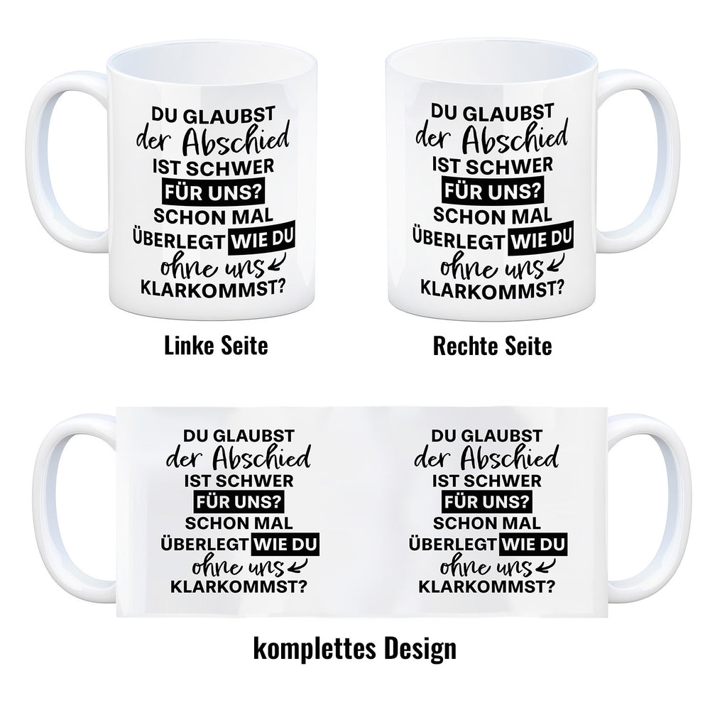 - 1x Abschied Kollege Kaffeebecher mit Spruch Wie kommst du ohne uns klar in der gewählten Ausführung