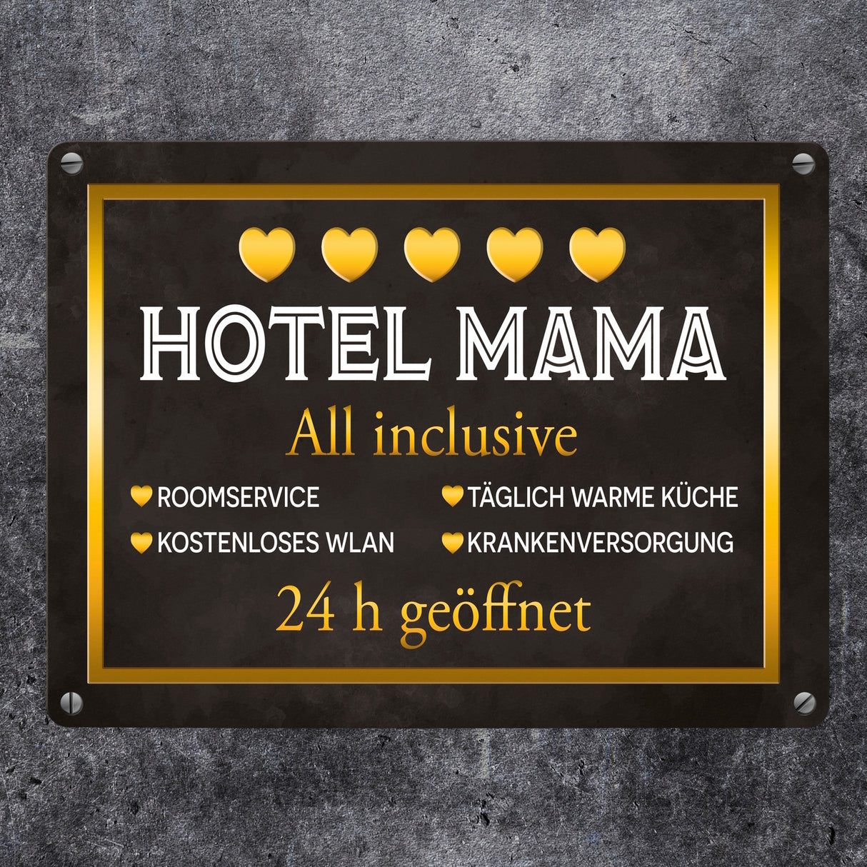 - Von der Service-Qualität einer Mutter kann sich ein Hotel noch einiges abschauen. Das Hotel Mama hat nicht umsonst eine 5-Herzen-Auszeichnung. Dieses Schild zeichnet das Zuhause deiner Mutter zum preisgekrönten Hotel Mama aus.